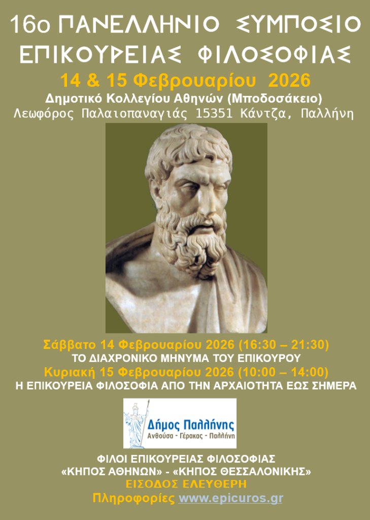 Ένα κορυφαίο πολιτιστικό γεγονός στη χώρα μας και διεθνώς θα πραγματοποιηθεί για δέκατη έκτη συνεχή χρονιά. Πρόκειται για το «16ο ΠΑΝΕΛΛΗΝΙΟ ΣΥΜΠΟΣΙΟ ΕΠΙΚΟΥΡΕΙΑΣ ΦΙΛΟΣΟΦΙΑΣ» που διοργανώνουν ο Δήμος Παλλήνης και οι Φίλοι Επικούρειας Φιλοσοφίας «Κήπος Αθηνών» και «Κήπος Θεσσαλονίκης» στο Δημοτικό Κολλεγίου Αθηνών-Μποδοσάκειο (Λεωφόρος Παλαιοπαναγιάς 15351 Κάντζα, Παλλήνη), το Σαββατοκύριακο 14-15 Φεβρουαρίου 2026.