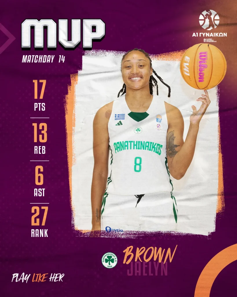 Η Τζάελιν Μπράουν, η οποία είχε αναδειχθεί MVP και την 11η Αγωνιστική, στην χθεσινή νίκη του Παναθηναϊκού με 83-79 επί του Πρωτέα Βούλας είχε 17 πόντους, 13 ριμπάουντ, 6 ασίστ, ένα κλέψιμο, μια τάπα και 27 στο σύστημα αξιολόγησης μετά από 33’40΄΄συμμετοχής.
