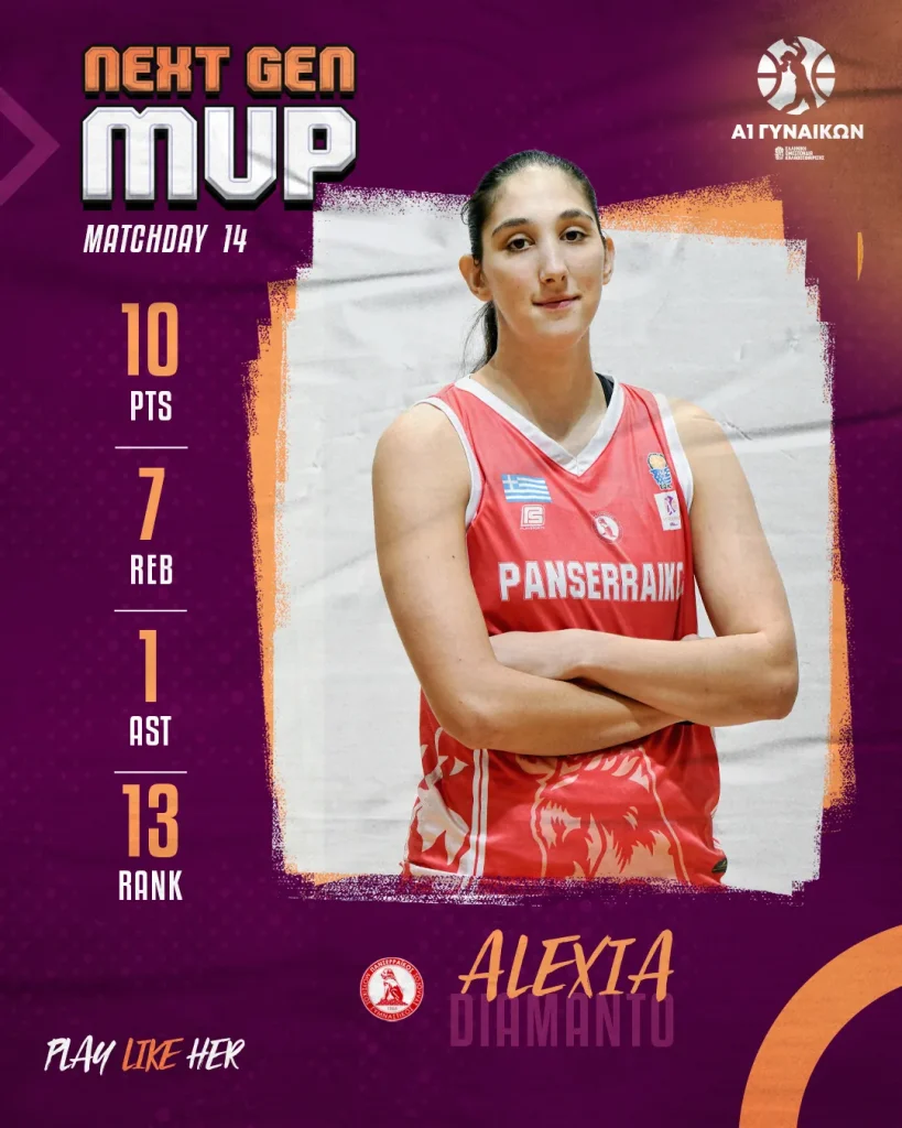 Από την άλλη η Διαμάντω Αλεξιά για 5η φορά τη φετινή σεζόν αναδεικνύεται MVP Next Gen. Η νεαρή σέντερ στην νίκη του Πανσερραϊκού με 79-54 επί του Αμύντα είχε 10 πόντους, 7 ριμπάουντ, μία ασίστ συγκεντρώνοντας 13 στο σύστημα αξιολόγησης μετά από 15’57’’ συμμετοχής.