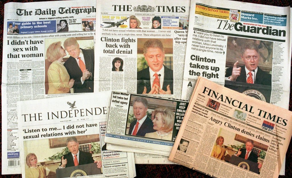 Τον Ιανουάριο του 1998, ο Πρόεδρος των ΗΠΑ Μπιλ Κλίντον προσπάθησε να διαψεύσει τις φήμες που απασχολούσαν τότε την Ουάσινγκτον με τη φράση που πιθανώς έγινε η πιο διάσημη της προεδρίας του: «Δεν είχα σεξουαλικές σχέσεις με αυτή τη γυναίκα». Η γυναίκα ήταν η Μόνικα Λεβίνσκι, μια ασκούμενη στο Λευκό Οίκο, λίγο πάνω από τα 20.