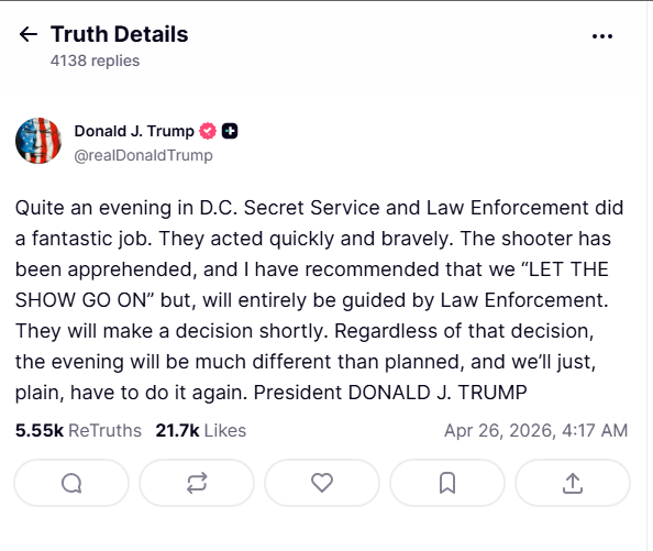 «Περάσαμε ένα αρκετά καλό βράδυ στην Ουάσινγκτον, η Μυστική Υπηρεσία και οι Αρχές Επιβολής του Νόμου έκαναν φανταστική δουλειά. Ενήργησαν γρήγορα και γενναία. Ο δράστης συνελήφθη και έχω συστήσει να «να αφήσουμε την παράσταση (εκδήλωση) να συνεχιστεί υπό την καθοδήγηση των αρχών. Ανεξάρτητα από αυτήν την απόφαση, η βραδιά θα είναι πολύ διαφορετική από ό,τι είχε προγραμματιστεί και, απλά, θα πρέπει να το ξανακάνουμε», δήλωσε ο Τραμπ στην ανάρτησή του στο Truth Social .