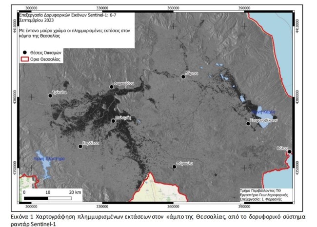Δεδομένα του δορυφορικού συστήματος ραντάρ Sentinel-1 χρησιμοποιήθηκαν για την χαρτογράφηση των πλημμυρισμένων εκτάσεων 6-7 Σεπτεμβρίου 2023. Το μεγάλο πλεονέκτημα των εικόνων Sentinel-1 είναι ότι δεν επηρεάζονται από τη νεφοκάλυψη.
