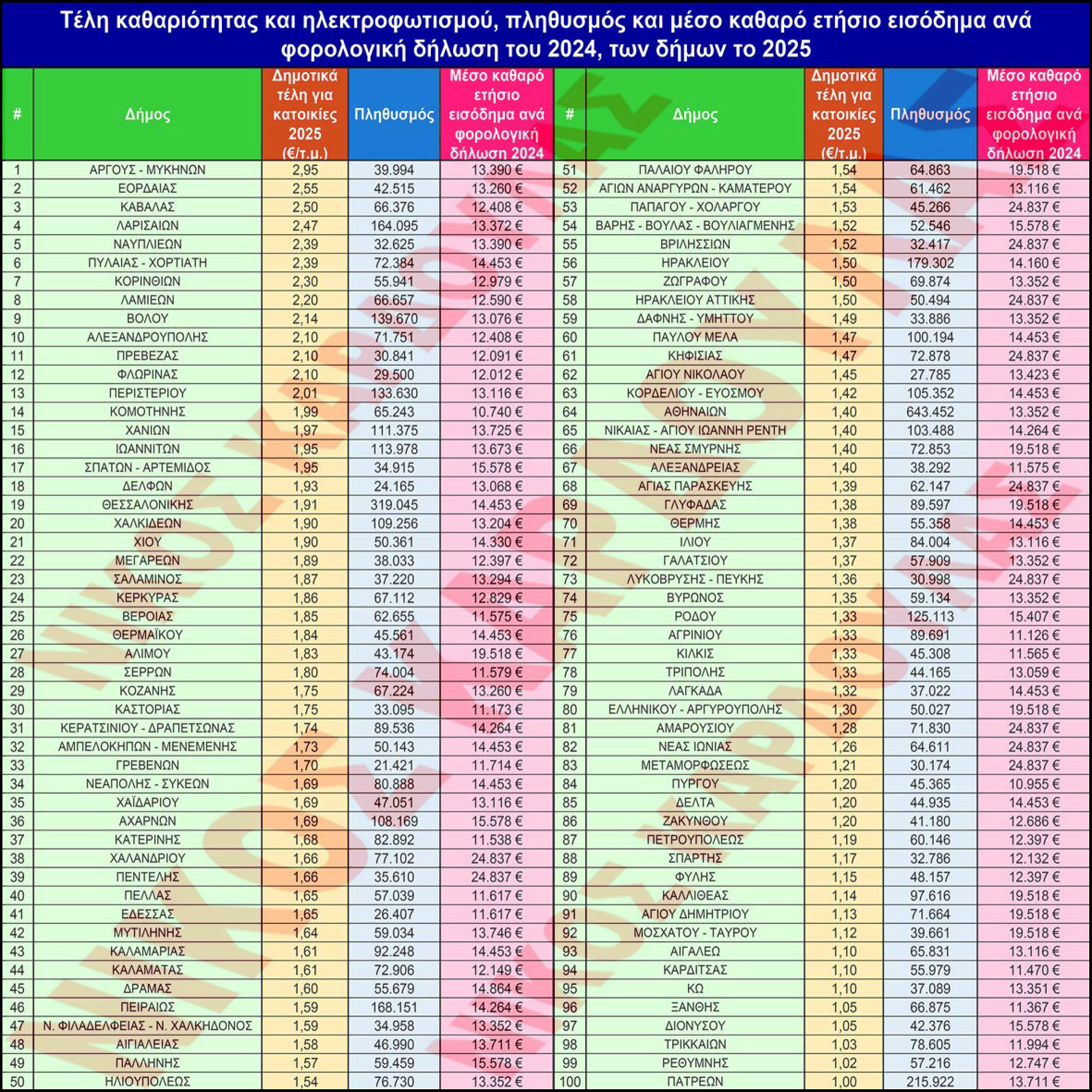 Με έρευνα στο διαδίκτυο εντοπίσθηκαν τα δημοτικά τέλη σε κατοικίες σε 100 δήμους της χώρας, τα οποία απεικονίζονται στον πίνακα. Στους δήμους που έχουν περισσότερες από μία ζώνες ΔΤ για κατοικίες, ελήφθη ο μέσος όρος. Στον πίνακα απεικονίζονται επίσης και ο πληθυσμός των δήμων (ΕΛΣΤΑΤ, απογραφή 2021), καθώς και το μέσο καθαρό εισόδημα ανά φορολογική δήλωση του 2024 για κάθε δήμο (ΑΑΔΕ). Το εισόδημα κάθε δήμου δεν είναι διαθέσιμο από την ΑΑΔΕ και σαν εισόδημα ελήφθη το εισόδημα της αντίστοιχης Περιφερειακής Ενότητας.