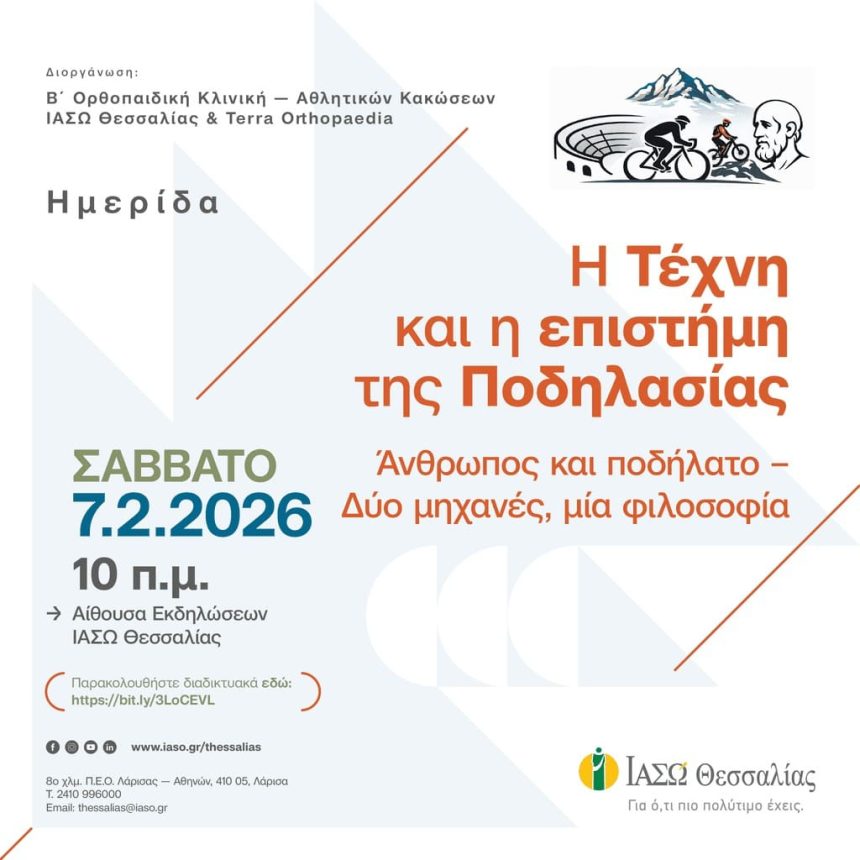 Η Β΄ Ορθοπαιδική Κλινική – Αθλητικών Κακώσεων του ΙΑΣΩ Θεσσαλίας σας προσκαλεί αυτό το Σάββατο 7 Φεβρουαρίου 2026 στην επιστημονική ημερίδα: « Άνθρωπος και ποδήλατο – Δύο μηχανές, μία φιλοσοφία»