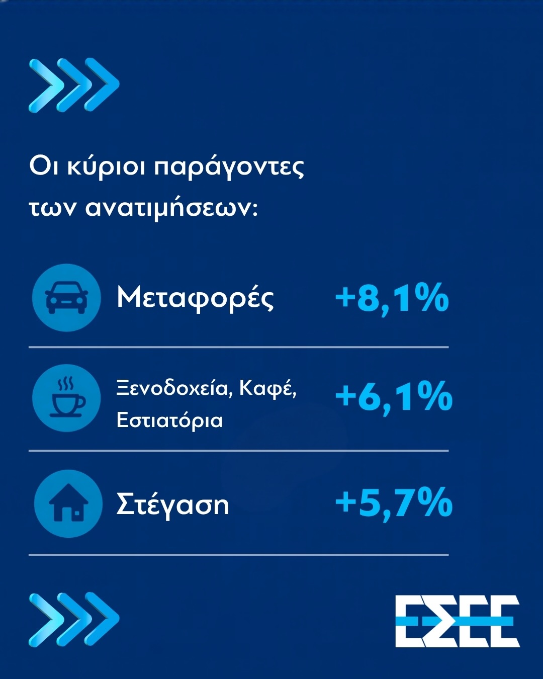 «Σύμφωνα με τα στοιχεία της έρευνας για τον πληθωρισμό Μαρτίου 2026, καταγράφεται επιτάχυνση των ανατιμήσεων, με βασικούς παράγοντες το ενεργειακό κόστος, τις μεταφορές και τη στέγαση», αναφέρει η Ελληνική Συνομοσπονδία Εμπορίου & Επιχειρηματικότητας και συμπληρώνει πως: «Οι πιέσεις αυτές διαχέονται στο σύνολο της οικονομίας, επηρεάζοντας τόσο τις επιχειρήσεις όσο και τους καταναλωτές».