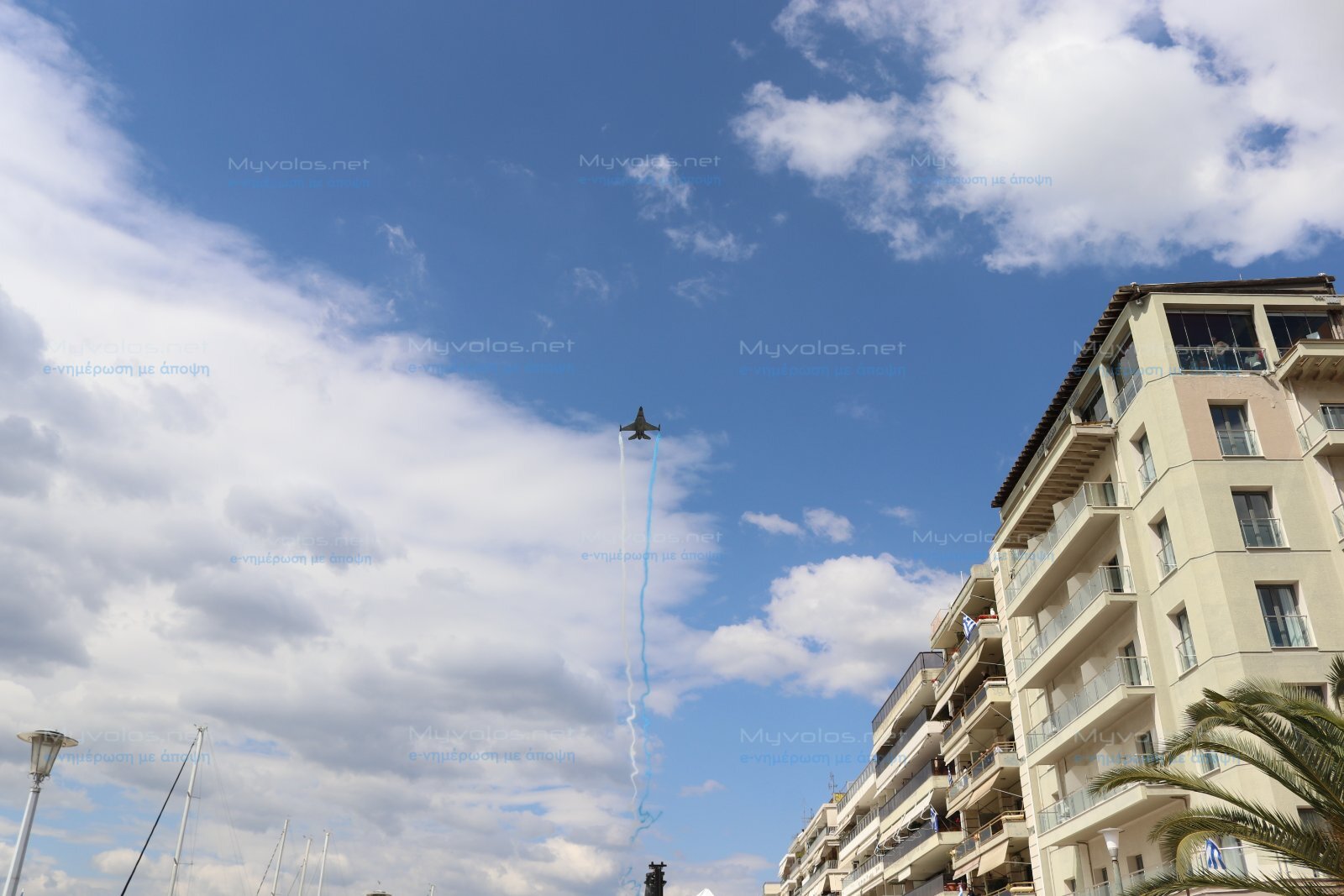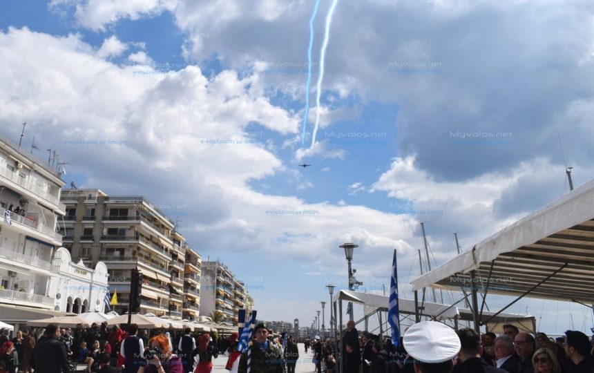 Ξεχωριστή στιγμή στην παρέλαση, η διπλή διέλευση πάνω από τον χώρο του παραλιακού μετώπου, μαχητικού αεροσκάφους F-16 της Ομάδας Αεροπορικών Επιδείξεων “ΖΕΥΣ” από την 111 ΠΜ Νέας Αγχιάλου με χειριστή τον Σμηναγό (Ι) Γεώργιο Σαμαλή.