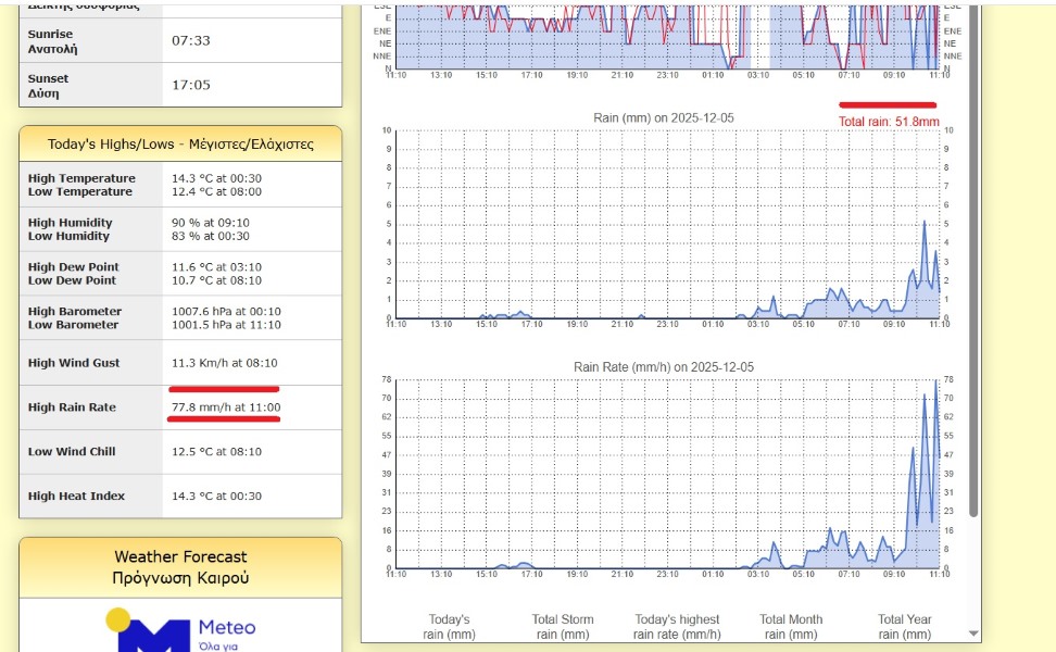 Επόμενο Ραγδαιότητα 78 mm (78 λίτρα νερού ανά τετραγωνικό επιφάνειας) σήμερα στις 11 π.μ. στον Βόλο