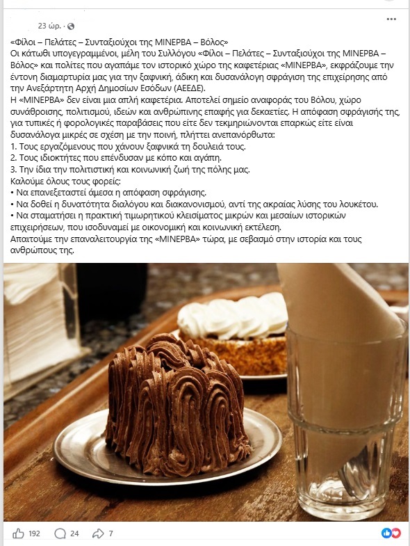 ‘Ατομο ή άτομα με τον τίτλο «Φίλοι – Πελάτες – Συνταξιούχοι της ΜΙΝΕΡΒΑ – Βόλος» ανάρτησαν χθες κείμενο με αφορμή το νέο προσωρινό κλείσιμο από την ΑΑΔΕ της επιχείρησης καφέ “Μινέρβα” εκφράζοντας την έντονη διαμαρτυρία τους για την διοικητική κύρωση της φορολογικής παράβασης.