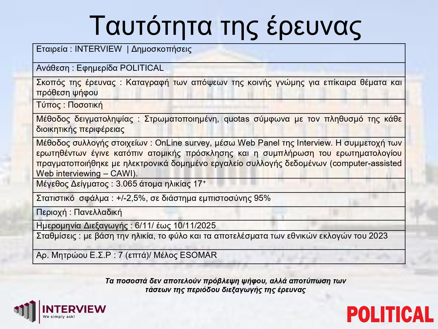 Στη δημοσκόπηση που διενεργήθηκε, στο διάστημα από τις 06/11 ως τις 10/11, η ΝΔ διατηρεί τις δυνάμεις της αλλά και τη διαφορά της από το ΠΑΣΟΚ, σε σχέση με την προηγούμενη δημοσκόπηση της ίδιας εταιρείας, ενώ ο Κυριάκος Μητσοτάκης παραμένει με διαφορά καταλληλότερος για πρωθυπουργός.