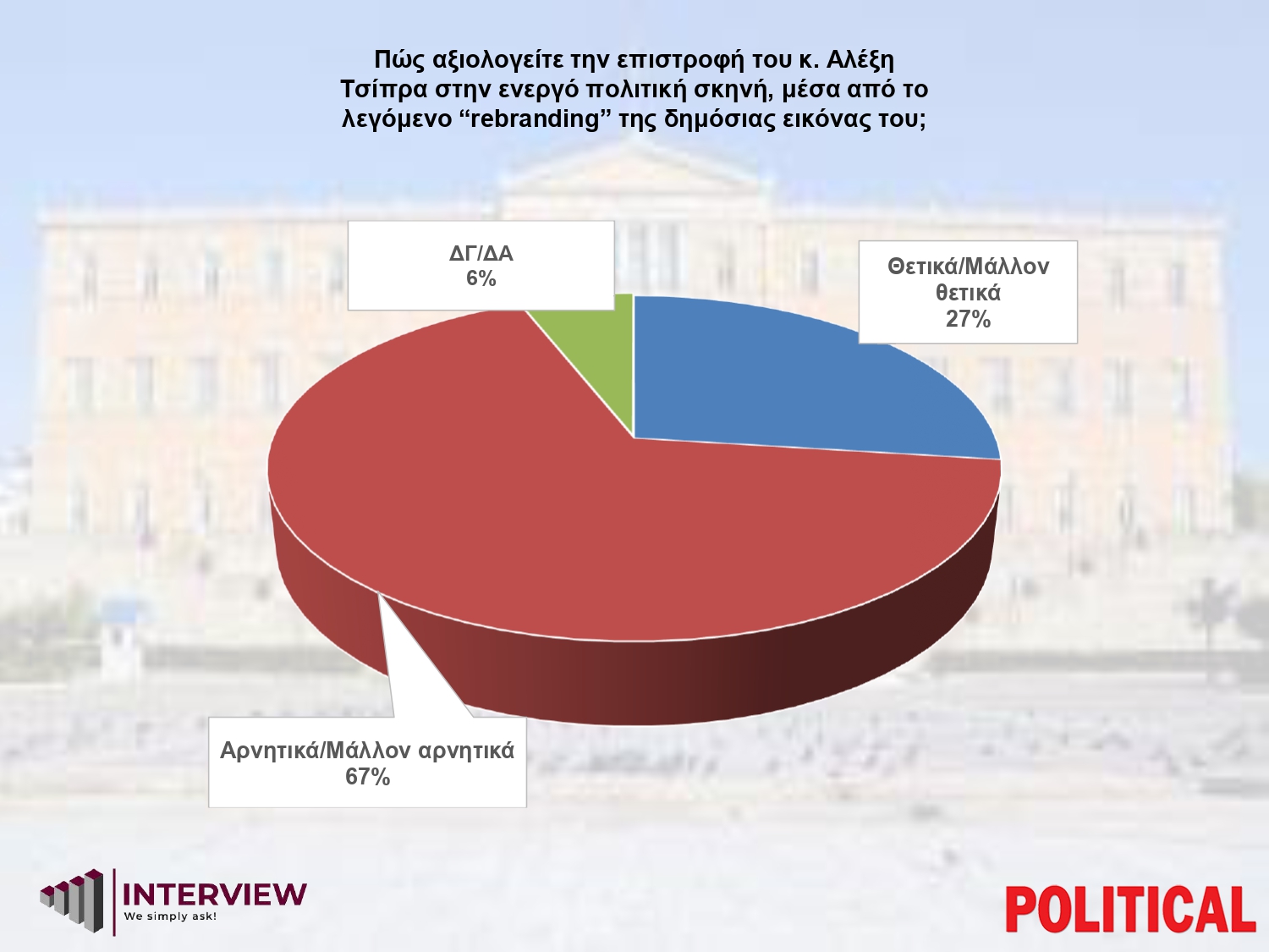 Ειδικότερα, στην ερώτηση πώς αξιολογείτε την επιστροφή του κ. Αλέξη Τσίπρα στην ενεργό πολιτική σκηνή, μέσα από το λεγόμενο «rebranding» της δημόσιας εικόνας του, το 29% απαντά θετικά/μάλλον θετικά, το 67% αρνητικά/μάλλον αρνητικά και το 6% ΔΞ/ΔΑ. Στην ερώτηση «θα αγοράζατε το βιβλίο του Αλ. Τσίπρα «Ιθάκη», το 22% απαντά ναι/μάλλον ναι, το 75% όχι/μάλλον όχι και το 3% ΔΞ/ΔΑ