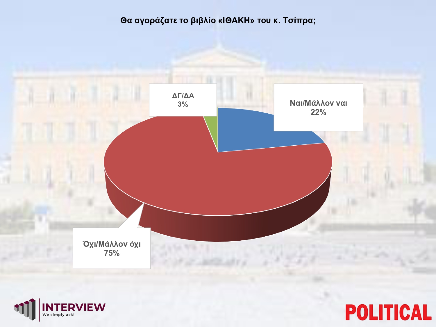 Η ίδια δημοσκόπηση αποκαλύπτει ότι μόλις δύο στους δέκα πολίτες θα αγόραζαν το βιβλίο «Ιθάκη» του Αλέξη Τσίπρα, με το οποίο ο πρώην πρωθυπουργός επιχειρεί να «ξανασυστηθεί» στους ψηφοφόρους. Ενώ το ποσοστό ανεβαίνει σε 3 στους 10, όταν ζητείται από τους ερωτώμενους να αξιολογήσουν την επιστροφή του κ. Αλέξη Τσίπρα στην ενεργό πολιτική σκηνή, μέσα από το λεγόμενο «rebranding» της δημόσιας εικόνας του.