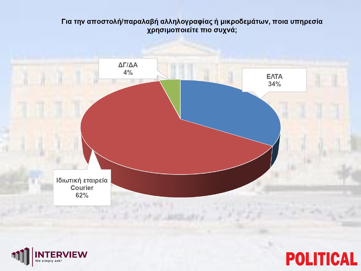 Ενδιαφέρον έχουν επίσης και οι απαντήσεις των πολιτών στην ερώτηση αν χρησιμοποιούν για την αποστολή/παραλαβή αλληλογραφίας ή μικροδεμάτων, πιο συχνά τα ΕΛΤΑ ή ιδιωτικές εταιρείες. Από τις απαντήσεις προκύπτει η πλειονότητα των πολιτών και συγκεκριμένα οι έξι στους δέκα δεν προτιμούν τα ΕΛΤΑ. Η ερώτηση έγινε με φόντο τις σοβαρές αναταράξεις που προκλήθηκαν στο εσωτερικό της κυβερνητικής παράταξης για την πρόθεση της κυβέρνησης να βάλει «λουκέτο» σε καταστήματα του φορέα, προκειμένου να διασφαλιστεί η επιβίωσή τους. Συγκεκριμένα, το 62% απαντά ότι προτιμά τις ιδιωτικές εταιρείες courier για αποστολή/παραλαβή αλληλογραφίας ή μικροδεμάτων, έναντι 34% που επιλέγει τα ΕΛΤΑ και 4% που απαντά ΔΞ/ΔΑ.