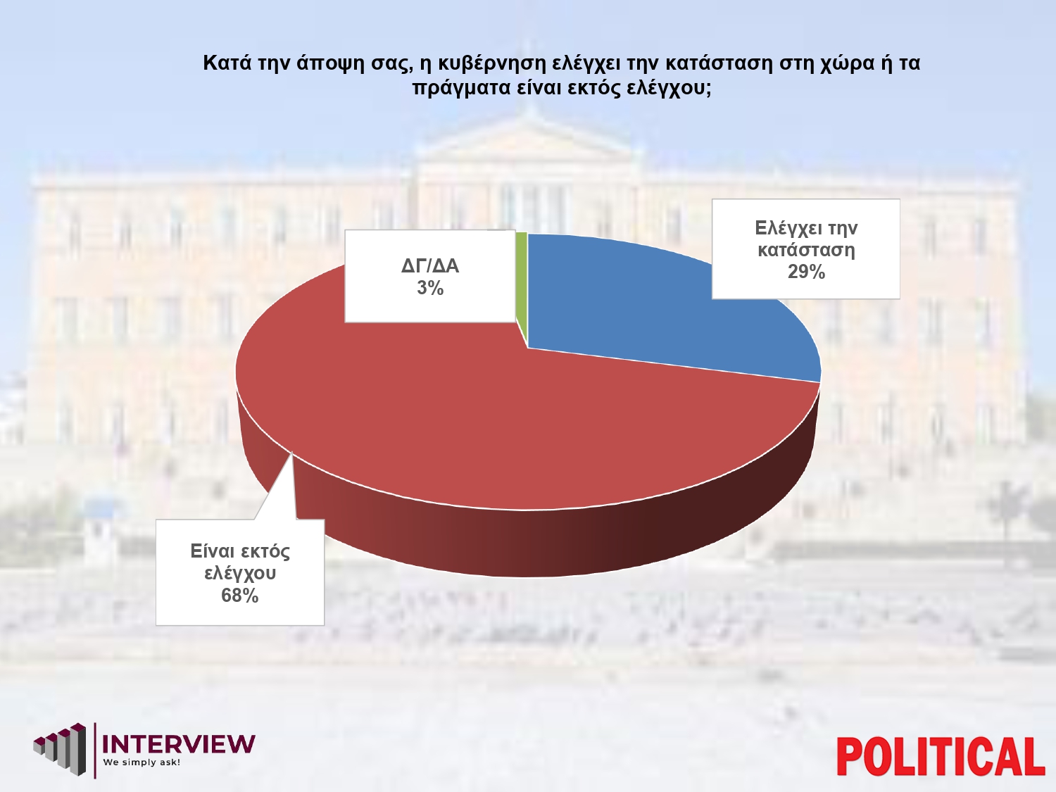 Σε ερώτηση αν η κυβέρνηση ελέγχει τα πράγματα στη χώρα ή η κατάσταση είναι εκτός ελέγχου, το 29% απαντά ότι ελέγχει την κατάσταση, έναντι 68% που θεωρεί ότι είναι εκτός ελέγχου και 3% που απαντά ΔΞ/ΔΑ. Το ποσοστό των θετικών απόψεων κινείται στα όρια εκλογικής επιρροής της ΝΔ, ενώ αντιστοίχως, το ποσοστό των αρνητικών για την κυβέρνηση απόψεων αποτελεί το άθροισμα των δυνάμεων των αντιπολιτευτικών κομμάτων στα κεντροαριστερά, αριστερά και δεξιά του εκλογικού φάσματος.