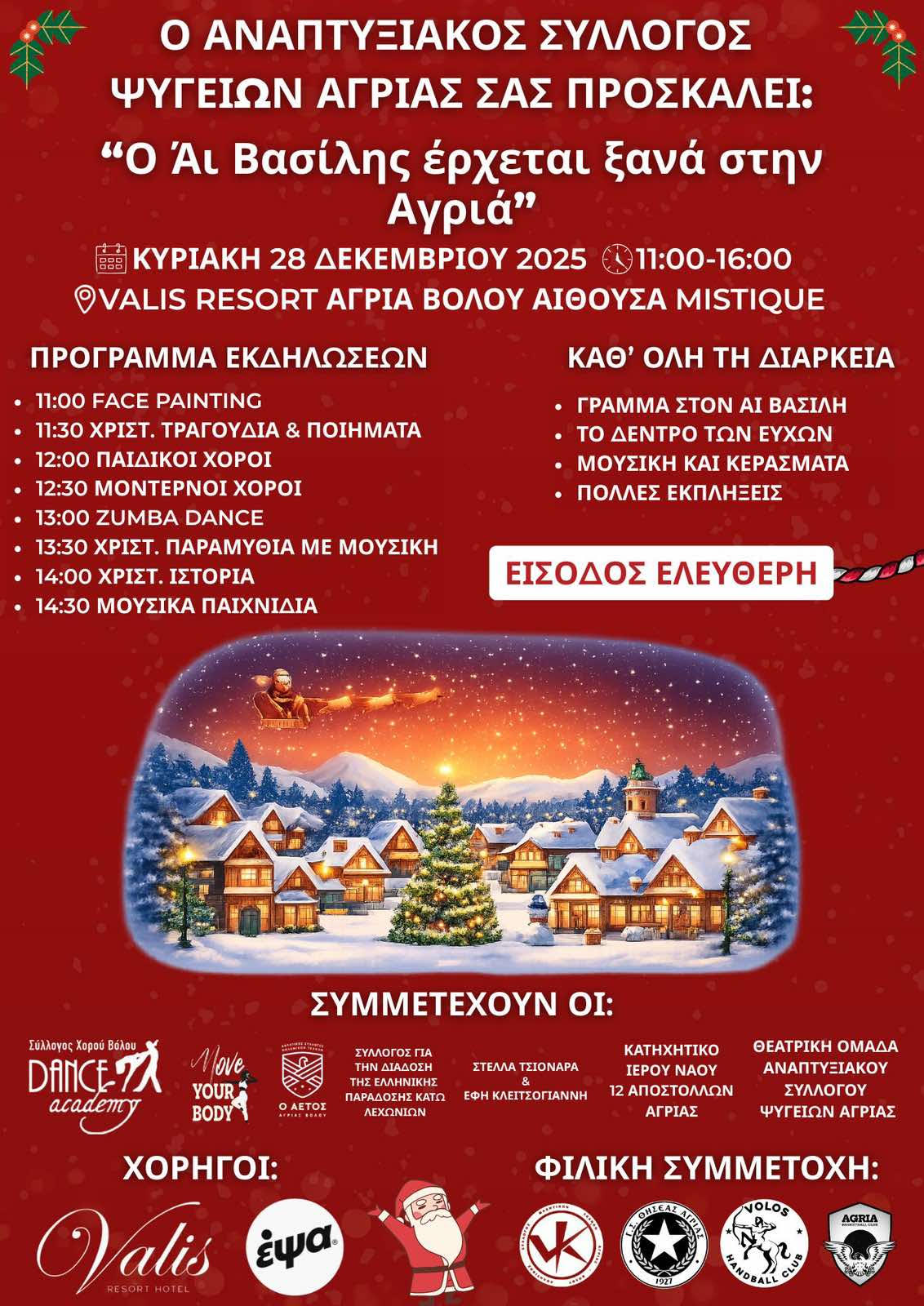 Χριστουγεννιάτικη γιορτή διοργανώνει ο Αναπτυξιακός Σύλλογος Περιοχής Ψυγείων Αγριάς, η οποία θα πραγματοποιηθεί στις 28 Δεκεμβρίου.