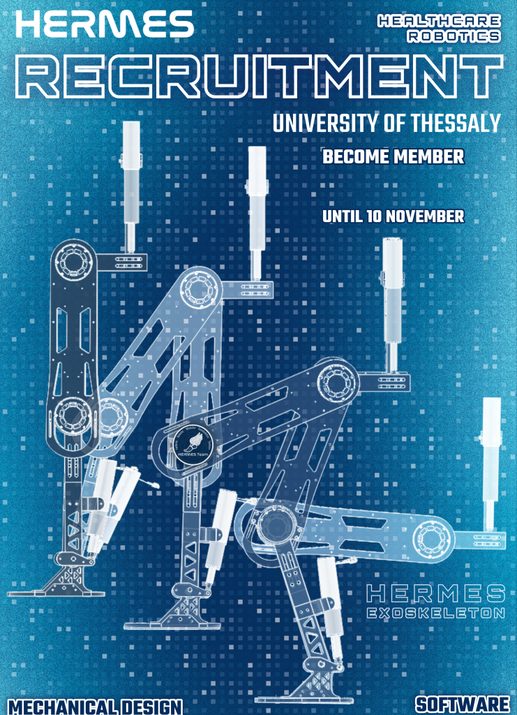 Η φοιτητική ερευνητική ομάδα HERMES Team του Πανεπιστημίου Θεσσαλίας ξεκινά δυναμικά το νέο ακαδημαϊκό έτος, επεκτείνοντας τα ερευνητικά της έργα και αναζητώντας νέα μέλη. Η ομάδα, που λειτουργεί υπό την αιγίδα του Τμήματος Ηλεκτρολόγων Μηχανικών και Μηχανικών Υπολογιστών, δραστηριοποιείται στον τομέα της ρομποτικής για ιατρικές εφαρμογές και αναπτύσσει τον πρώτο ελληνικό ρομποτικό εξωσκελετό για άτομα με Κάκωση Νωτιαίου Μυελού (SCI).