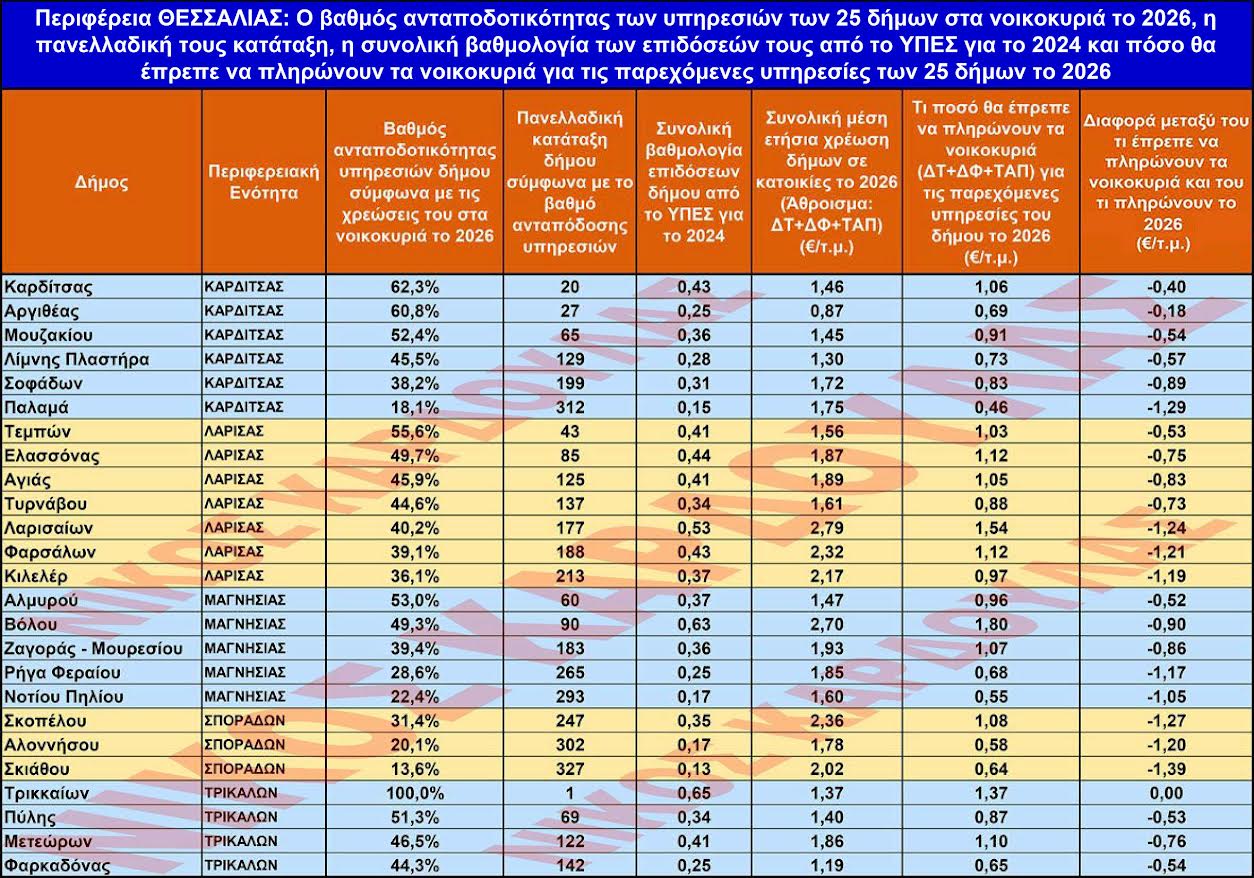 Στον παρακάτω πίνακα απεικονίζονται η πανελλαδική κατάταξη των 25 δήμων της Θεσσαλίας σύμφωνα με το βαθμό ανταπόδοσης υπηρεσιών, ο βαθμός ανταποδοτικότητας των υπηρεσιών των δήμων, η συνολική βαθμολογία των επιδόσεων των δήμων από το ΥΠΕΣ, η συνολική μέση ετήσια επιβάρυνση νοικοκυριών από τους δήμους, τι ποσό έπρεπε να πληρώνουν τα νοικοκυριά (Άθροισμα: ΔΤ+ΔΦ+ΤΑΠ) για τις παρεχόμενες υπηρεσίες των δήμων και η διαφορά μεταξύ του τι έπρεπε να πληρώνουν τα νοικοκυριά και του τι πληρώνουν, ανά Περιφερειακή Ενότητα (ΠΕ).