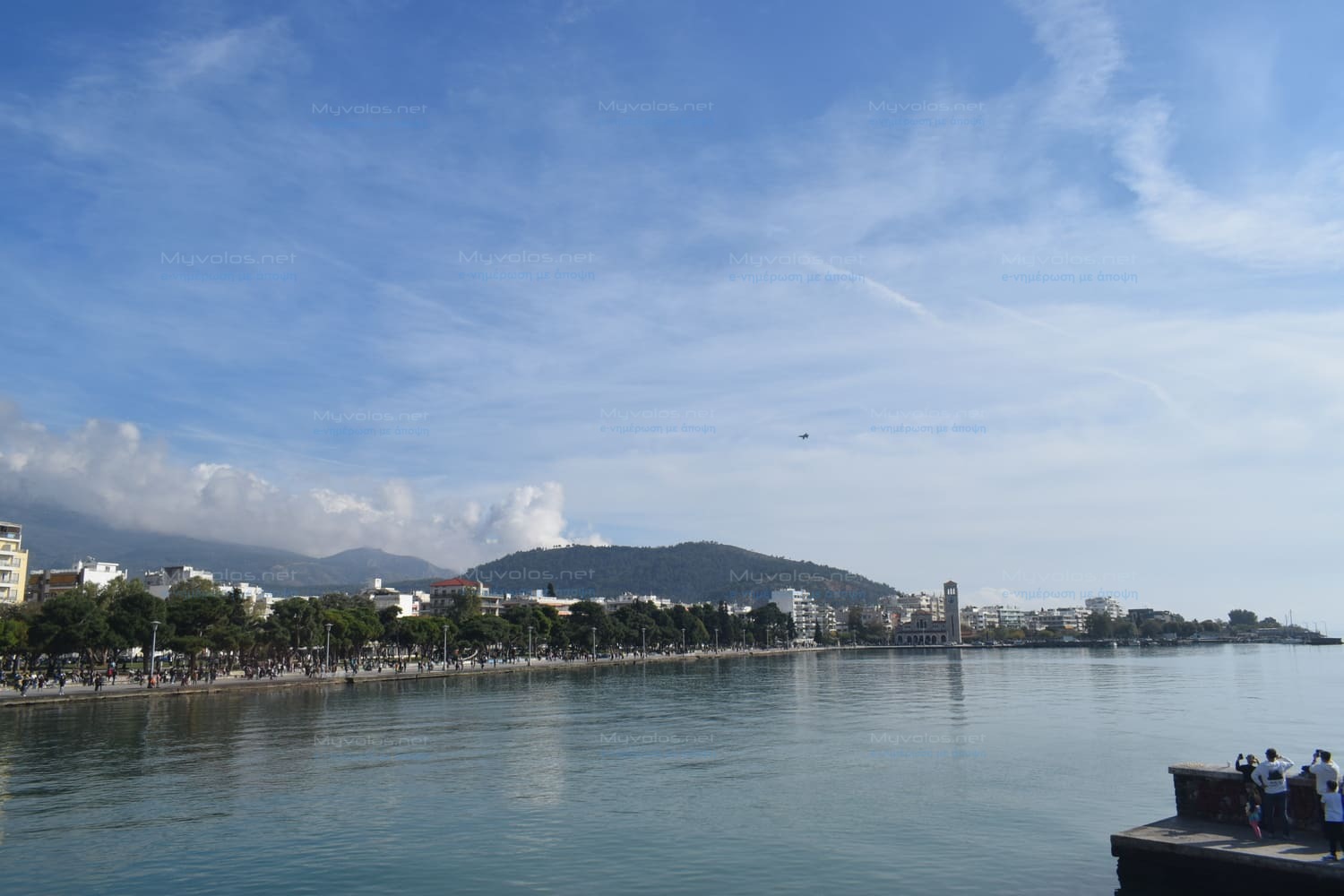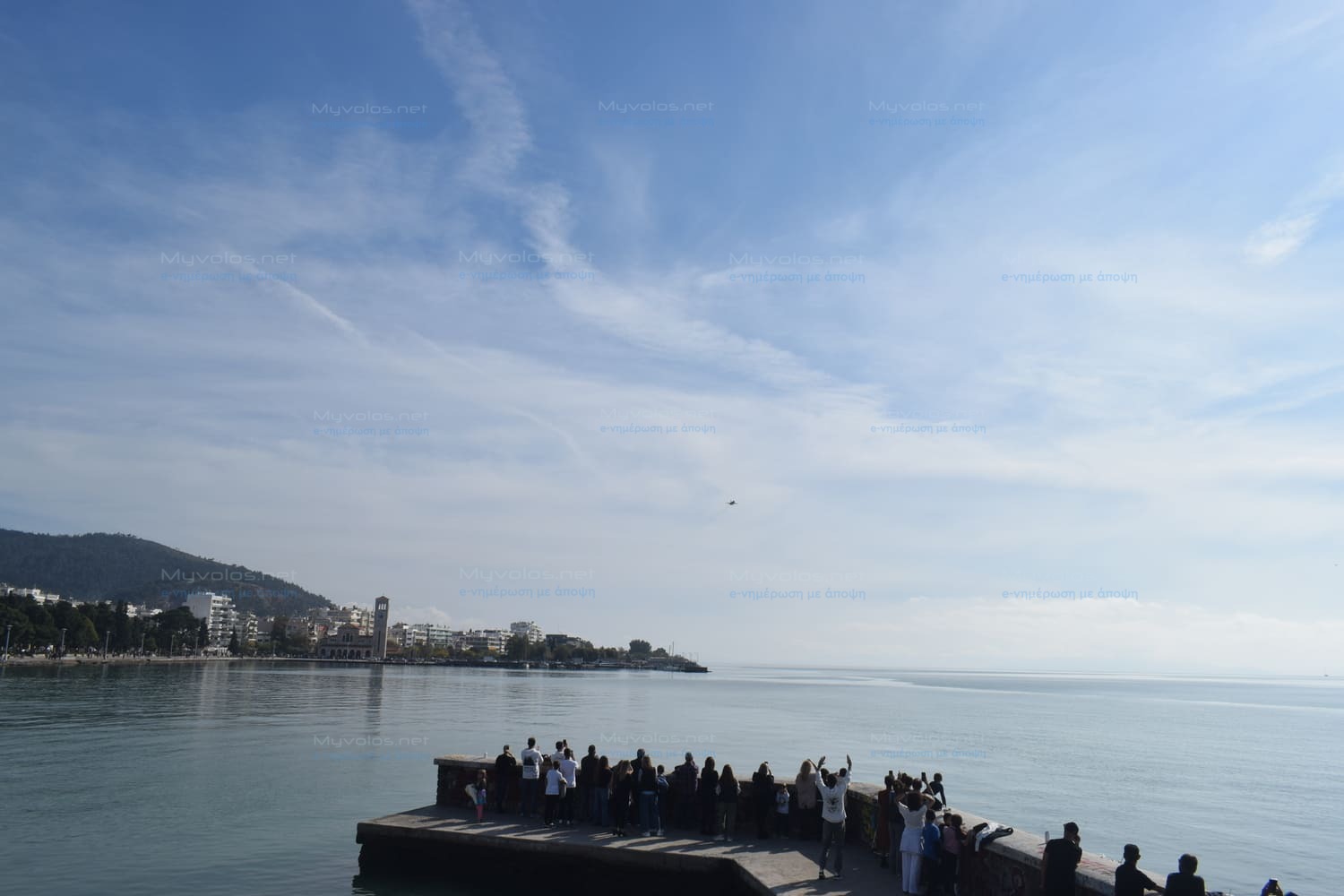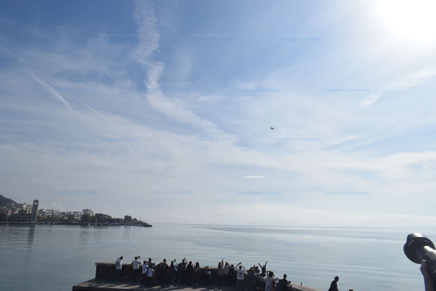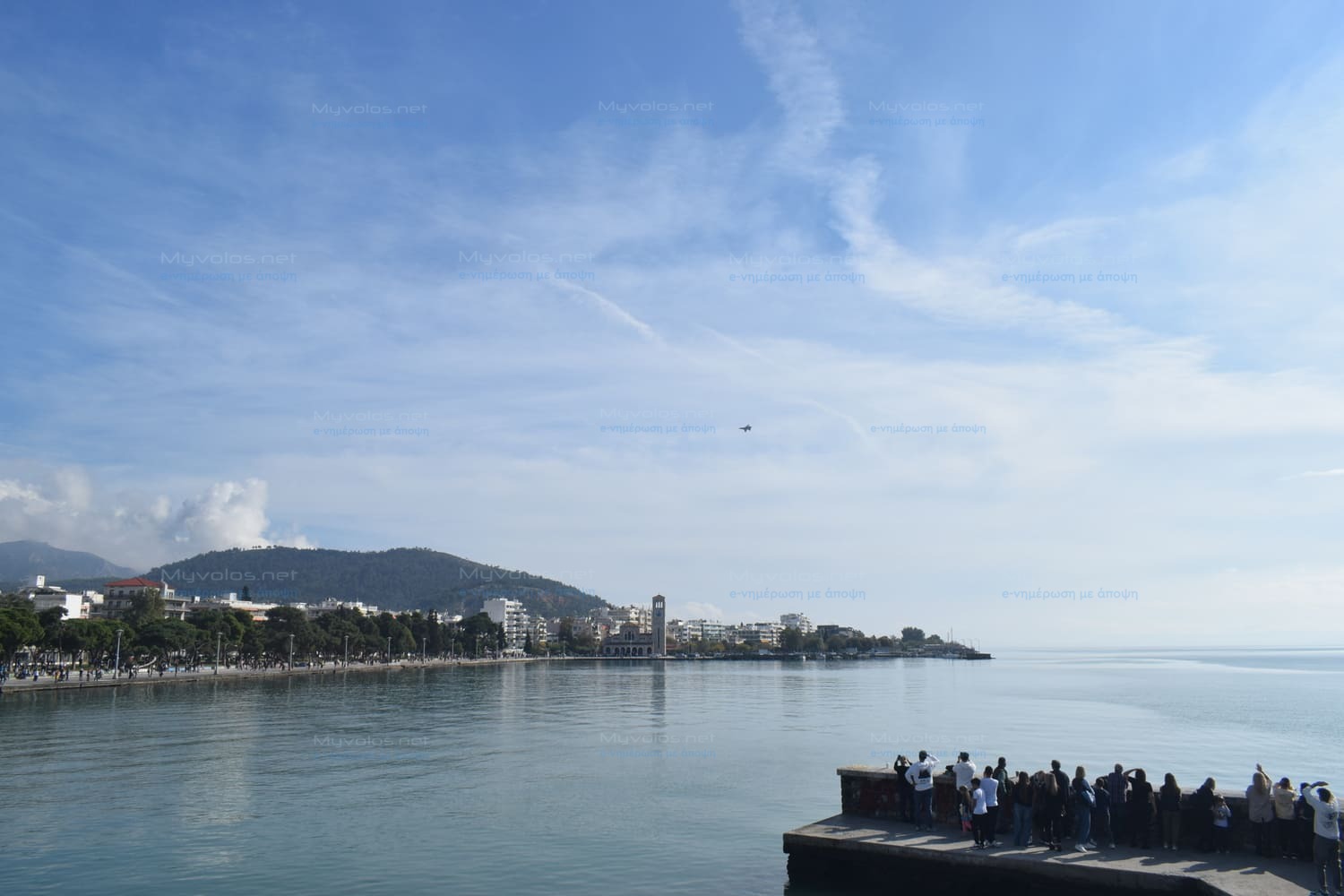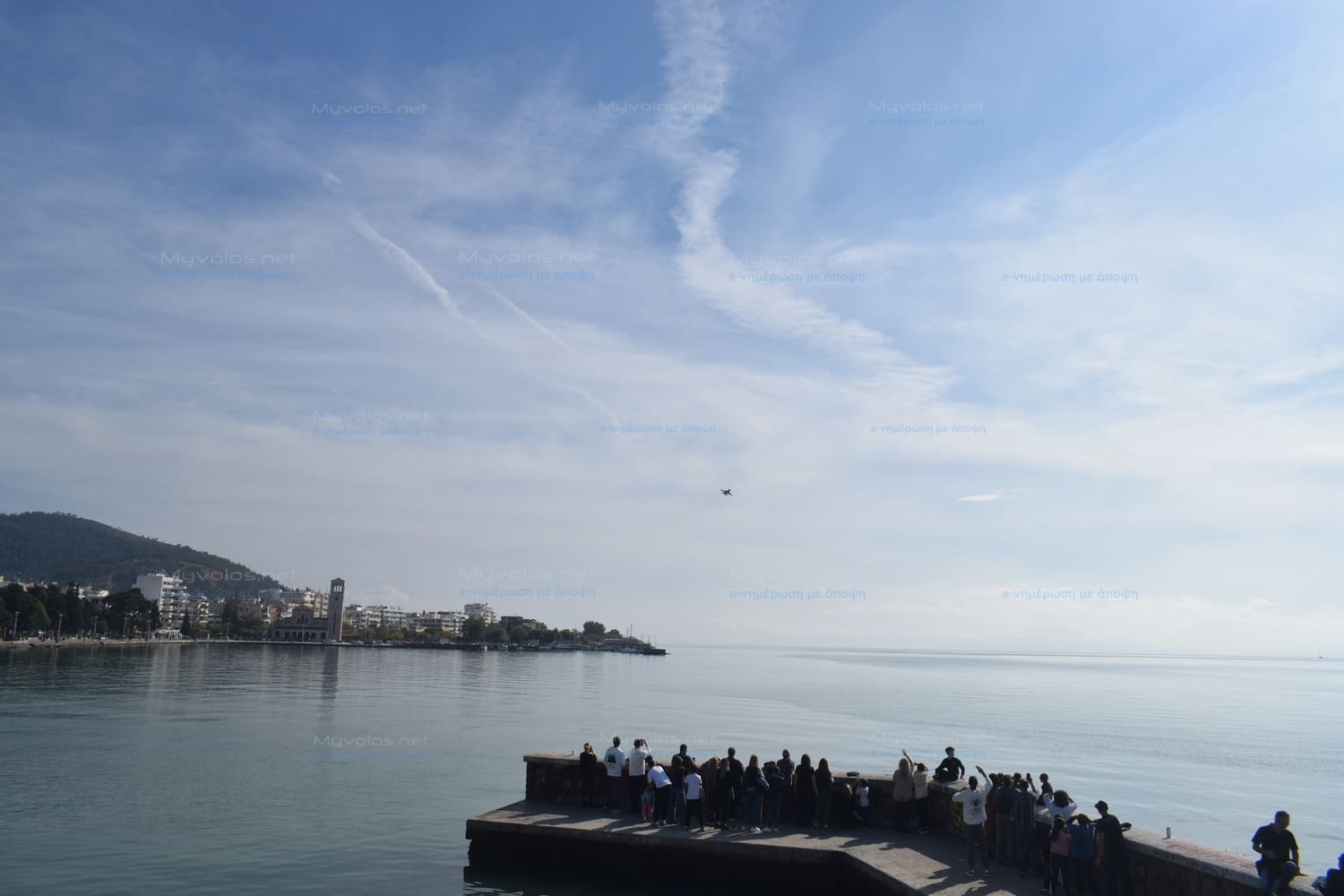Χιλιάδες βλέμματα στην ηλιόλουστη παραλία του Βόλου επικεντρώθηκαν σήμερα στον ουρανό της πόλης θαυμάζοντας τους εντυπωσιακούς ελιγμούς του μαχητικού αεροσκάφους της F-16 Demo Team ΖΕΥΣ.