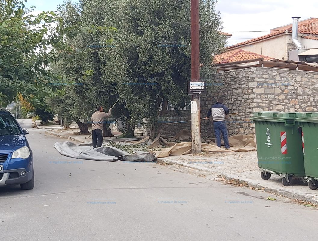 Ακόμη και η συγκομιδή της ελιάς στο πεζοδρόμιο, με τον λούρο (ελαιοραβδιστικό) και τις λινάτσες, φαίνεται να ακολουθούν χρόνους από τον παλιό Βόλο
