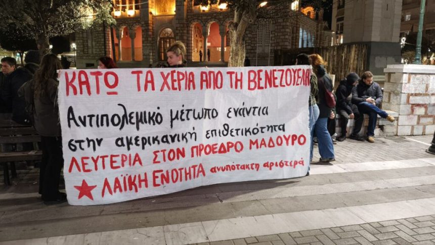 Χθες, Τρίτη 13/1, πραγματοποιήθηκε στον Βόλο, συγκέντρωση ενάντια στην απαγωγή του Προέδρου της Βενεζουέλας, Νικόλας Μαδούρο και της συζύγου του, την ιμπεριαλιστική επέμβαση των ΗΠΑ και την έκφραση Διεθνιστικής Αλληλεγγύης στο Βενεζουελάνικο Λαό, μετά από πρωτοβουλία που πήραν κόμματα και οργανώσεις της αριστεράς, μεταξύ των οποίων και η Λαϊκή Ενότητα – ΑΑ. Η ΛΑΕ – ΑΑ έδωσε το παρόν, όπως και σε κάθε κινητοποίηση αλληλεγγύης προς τον λαό της Βενεζουέλας, επιδιώκοντας να συμβάλει στην οικοδόμηση ενός μαζικού και συνεπούς αντιιμπεριαλιστικού κινήματος ενάντια στους αμερικανονατοικούς σχεδιασμούς.