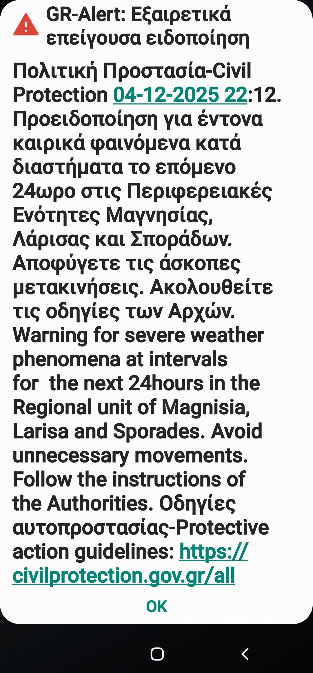 «Προειδοποίηση για τα έντονα καιρικά φαινόμενα κατά διαστήματα το επόμενο 24ωρο (Παρασκευή 5 Δεκεμβρίου 2025) στις Περιφερειακές Ενότητες Μαγνησίας, Λάρισας και Σποράδων. Αποφύγετε τις άσκοπες μετακινήσεις. Ακολουθείτε τις οδηγίες των Αρχών», αναφέρει το μήνυμα.