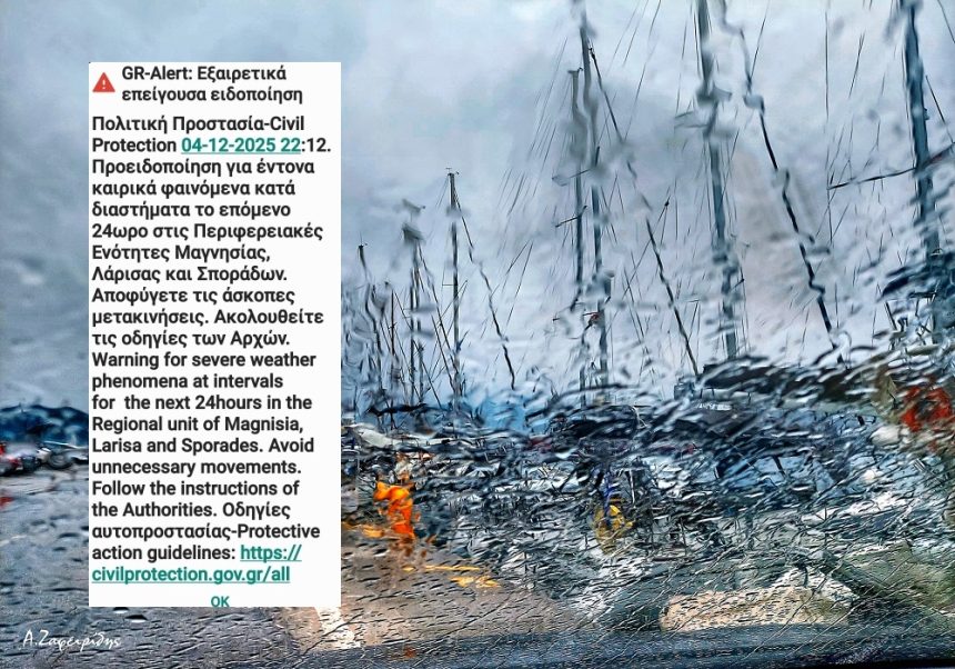 «Προειδοποίηση για τα έντονα καιρικά φαινόμενα κατά διαστήματα το επόμενο 24ωρο (Παρασκευή 5 Δεκεμβρίου 2025) στις Περιφερειακές Ενότητες Μαγνησίας, Λάρισας και Σποράδων. Αποφύγετε τις άσκοπες μετακινήσεις. Ακολουθείτε τις οδηγίες των Αρχών», αναφέρει το μήνυμα.