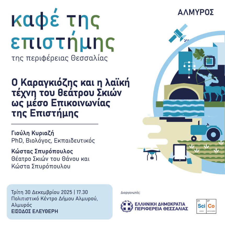 Στο πλαίσιο αυτό, την Τρίτη 30 Δεκεμβρίου 2025, στις 17.30, στο Πολιτιστικό Κέντρο Δήμου Αλμυρού, στον Αλμυρό, θα πραγματοποιηθεί η εκδήλωση με τίτλο «Ο Καραγκιόζης και η λαϊκή τέχνη του Θεάτρου Σκιών ως μέσο Επικοινωνίας της Επιστήμης».