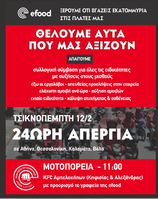 Στη σχετική ανακοίνωση αναφέρουν πως: «Την Πέμπτη 12 Φεβρουαρίου(Τσικνοπέμπτη) προχωράμε σε 24ωρη πανελλαδική απεργία κλιμακώνοντας τον αγώνα μας για αξιοπρεπείς συνθήκες εργασίας, αυξήσεις στους μισθούς και τερματισμό της επισφάλειας. Στις 11:00 το πρωί θα πραγματοποιηθεί συγκέντρωση στα KFC στη συμβολή Κηφισίας και Αλεξάνδρας, με προορισμό τα γραφεία της efood.