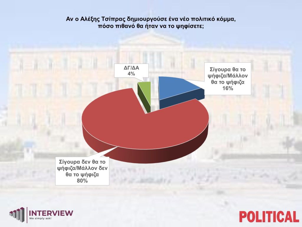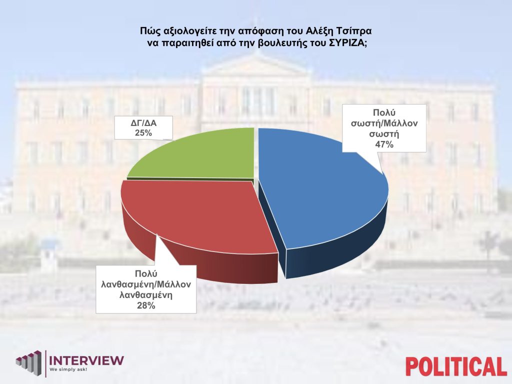 Η απόφαση του Αλέξη Τσίπρα να παραιτηθεί από τη Βουλή αξιολογείται θετικά από το 47% και αρνητικά από το 28%. Αν ίδρυε νέο κόμμα, μόλις 16% δηλώνουν ότι θα το ψήφιζαν, ενώ 80% το απορρίπτουν.