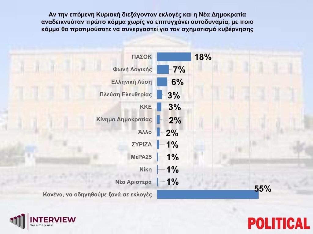 Αν η Νέα Δημοκρατία δεν πετύχει αυτοδυναμία στις επόμενες εκλογές, πρώτη προτίμηση για κυβερνητικό εταίρο είναι το ΠΑΣΟΚ με 18%, ενώ το 55% δηλώνει ότι σε ένα τέτοιο ενδεχόμενο προτιμά να οδηγηθούμε εκ νέου σε κάλπες.