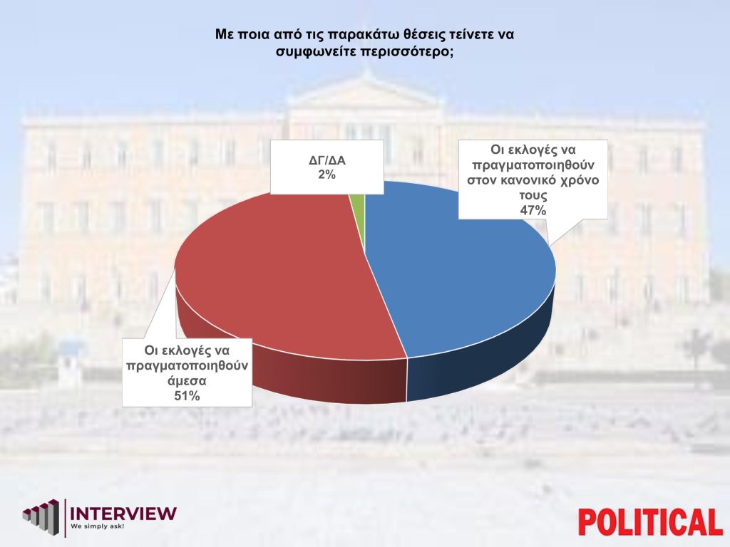Το 51% των ερωτηθέντων επιθυμεί οι εκλογές να γίνουν άμεσα, ενώ το 47% δηλώνει ότι πρέπει να διεξαχθούν στον κανονικό χρόνο τους. Το εύρημα αυτό υπογραμμίζει ότι το εκλογικό σώμα κινείται ανάμεσα στην επιθυμία για πολιτική σταθερότητα και στην πίεση για ανανέωση του πολιτικού σκηνικού.
