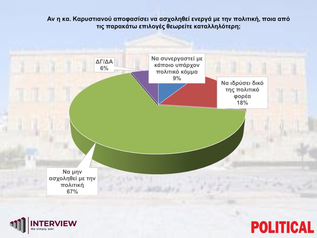 Αντίστοιχα, το 67% δηλώνει ότι η Μαρία Καρυστιανού δεν πρέπει να ασχοληθεί ενεργά με την πολιτική, δείγμα περιορισμένης θεσμικής απήχησης πέραν της δημοσιότητας.