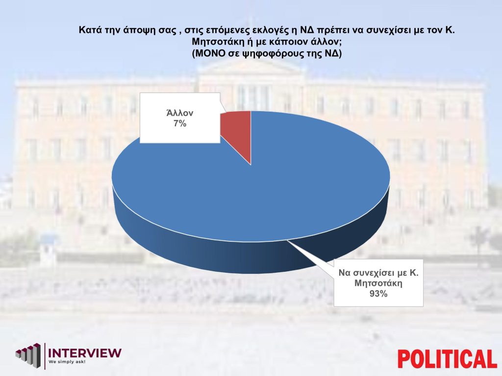 Στο εσωτερικό της ΝΔ, η στήριξη προς τον Κυριάκο Μητσοτάκη παραμένει καθολική: το 93% των ψηφοφόρων του κόμματος θεωρεί ότι πρέπει να συνεχίσει ως αρχηγός, έναντι 7% που προτιμά αλλαγή προσώπου.