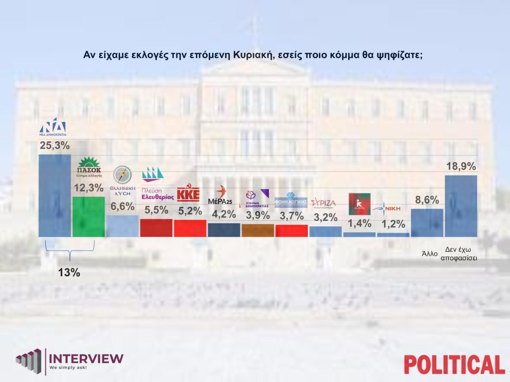 Σαφές προβάδισμα της Νέας Δημοκρατίας, σταθερή παρουσία του ΠΑΣΟΚ στη δεύτερη θέση και καθαρά χαμηλές επιδόσεις του ΣΥΡΙΖΑ, καταγράφει η νέα πανελλαδική δημοσκόπηση της INTERVIEW για την εφημερίδα POLITICAL, που διεξήχθη το διάστημα 1–8 Οκτωβρίου 2025 σε δείγμα 3.282 πολιτών, με μέθοδο CAWI και στατιστικό σφάλμα ±2,5%.