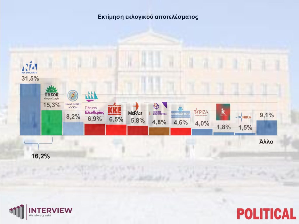 Στην εκτίμηση εκλογικού αποτελέσματος, η Νέα Δημοκρατία συγκεντρώνει 31,5%, διατηρώντας καθαρή πρωτοπορία. Στη δεύτερη θέση βρίσκεται το ΠΑΣΟΚ με 15,3%, ενώ ακολουθούν: