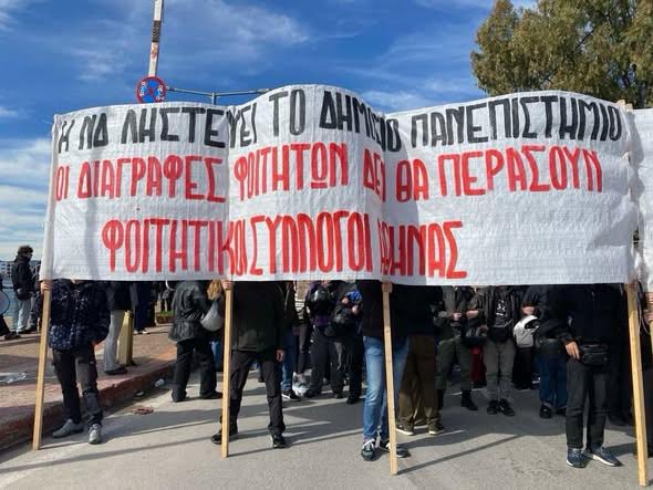 Όσο όμως και να προσπαθεί η Νέα Δημοκρατία να μας τρομοκρατήσει και να διαλύσει την προοπτική μας, οφείλει να γνωρίζει ότι θα βρει μπροστά της το φοιτητικό κίνημα. Το φοιτητικό κίνημα δεν αποδέχεται τις διαγραφές! Το φοιτητικό κίνημα δεν τρομοκρατείται, ούτε από την κυβέρνηση ούτε από κάθε λογής εγκάθετό της στα πανεπιστήμια! Να σταματήσει τώρα κάθε πειθαρχική και ποινική διαδικασία εναντίον φοιτητών! Απαιτούμε να παρθούν πίσω τώρα οι λίστες διαγραφών από τα ιδρύματα! Κάτω τα χέρια από το δημόσιο δωρεάν πανεπιστήμιο! Η αστυνομία και η καταστολή δε χωράνε στο πανεπιστήμιο. Η Σύνοδος Πρυτάνεων να τοποθετηθεί ενάντια στην πραξικοπηματική εφαρμογή του μέτρου των διαγραφών!