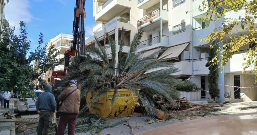 Στο οδόστρωμα της οδού Ρήγα Φεραίου και σε ένα σταθμευμένο σκούτερ κατέληξε ένας πανύψηλος φοίνικας ο οποίος δεν άντεξε τους ισχυρούς ανέμους που έπνεαν σήμερα στον Βόλο.