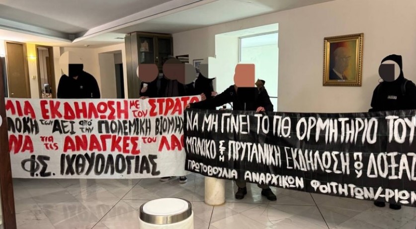 Παρέμβαση με πανώ και συνθήματα στους τοίχους της Πρυτανείας του Πανεπιστημίου Θεσσαλίας στον Βόλο πραγματοποίησε ομάδα αναρχικών.
