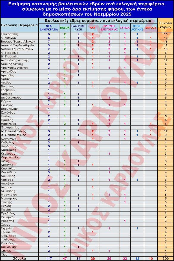 Συγκεκριμένα ο στατιστικολόγος και πολιτικός αναλυτής Νίκος Καρδούλας, ανάρτησε στο Facebook την εκτίμηση κατανομής των βουλευτικών εδρών ανά εκλογική περιφέρεια, σύμφωνα με το μέσο όρο εκτίμησης ψήφου των έντεκα δημοσκοπήσεων του Νοεμβρίου 2025 και γράφει στην ανάρτησή του: