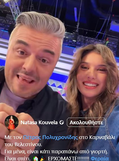 Στο καρναβάλι Βελεστίνου, στην ιδιαίτερη πατρίδα της, θα βρεθεί στις 22 Φεβρουαρίου η συμπαρουσιάστρια του “τροχού της τύχης” Νατάσα Κουβελά μαζί με τον παρουσιαστή του αγαπημένου τηλεπαιχνιδιού Πέτρο Πολυχρονίδη.