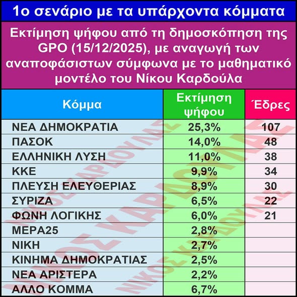 Σενάρια κατανομής βουλευτικών εδρών σύμφωνα με στοιχεία τελευταίας δημοσκόπησης, επεξεργάστηκε και δημοσίευσε ο πολιτικός αναλυτής κ. Νικ. Καρδούλας.