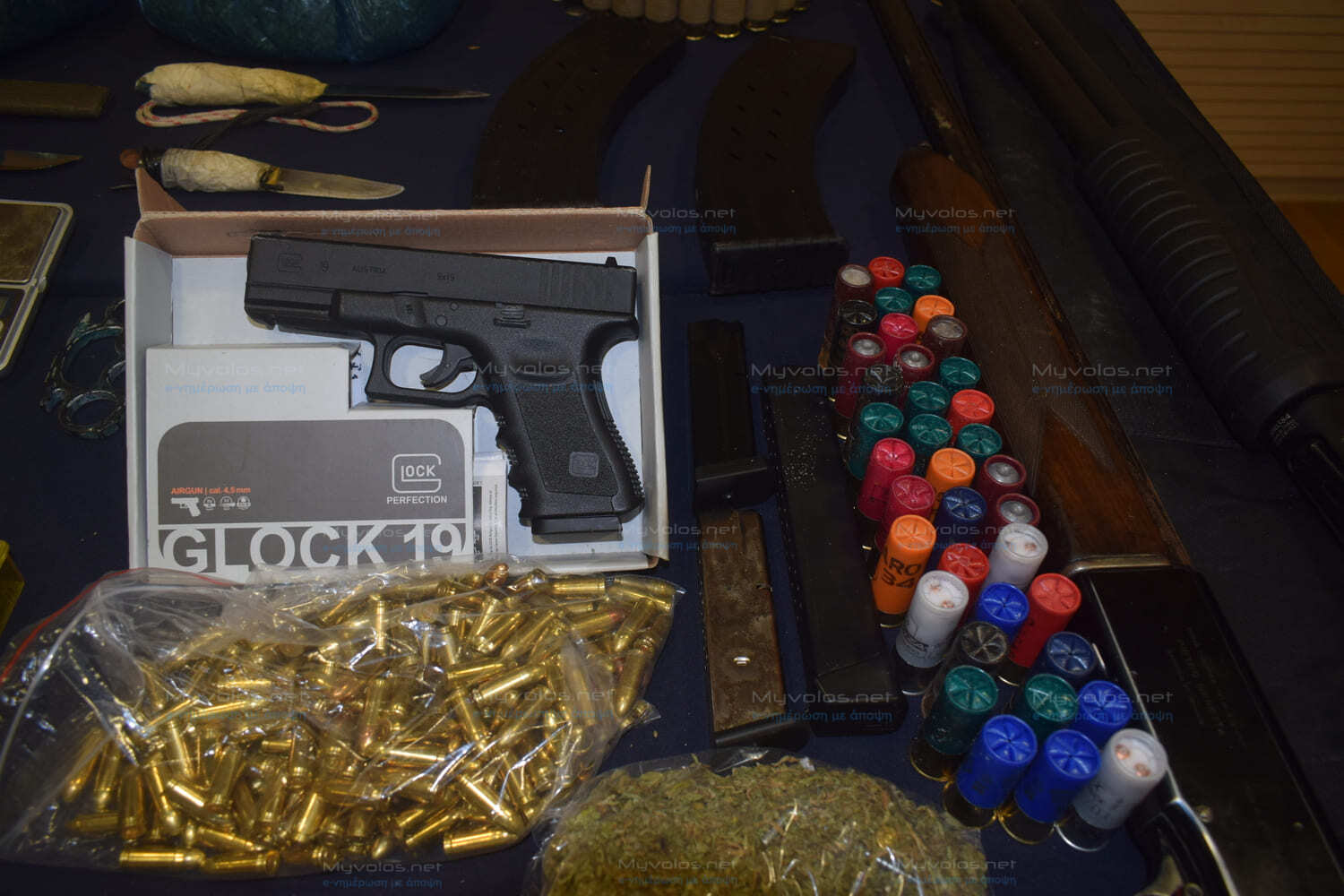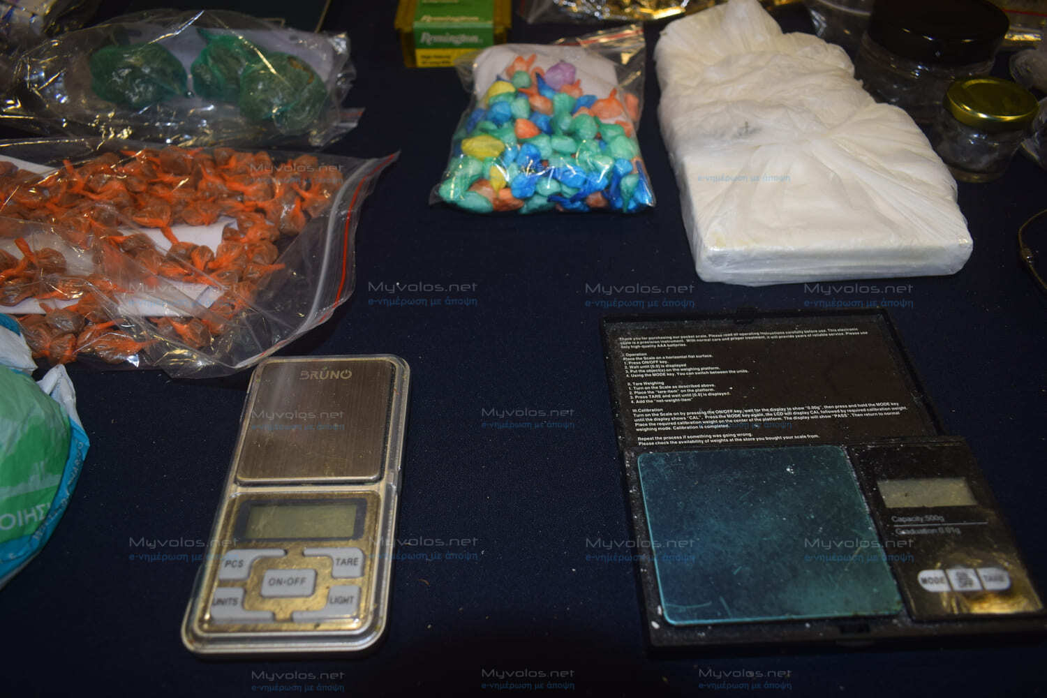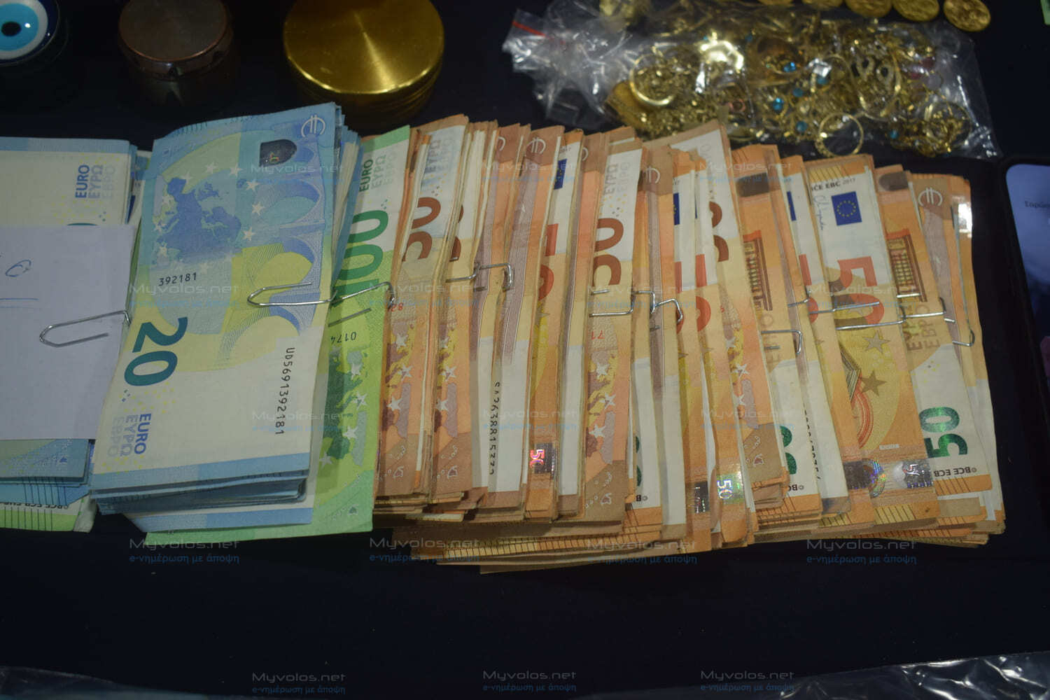 52 κινητά τηλέφωνα, μεγάλες ποσότητες χασίς, κοκαίνης και ηρωίνης, συσκευασίες (φιξάκια) έτοιμα για πώληση, πολλά κλοπιμαία που παρελάμβανε η συμμορία αντί χρημάτων για να διαθέτει ναρκωτικά (χρυσαφικά, λίρες, ηλεκτρικά πατίνια κ.α.), όπλα, σφαίρες διαφόρων διαμετρημάτων, ζυγαριές, περισσότερα από 70.000 ευρώ σε μετρητά, είναι μερικά από τα κατασχεθέντα τα οποία παρουσιάστηκαν σήμερα στα ΜΜΕ στο Αστυνομικό Μέγαρο Βόλου.