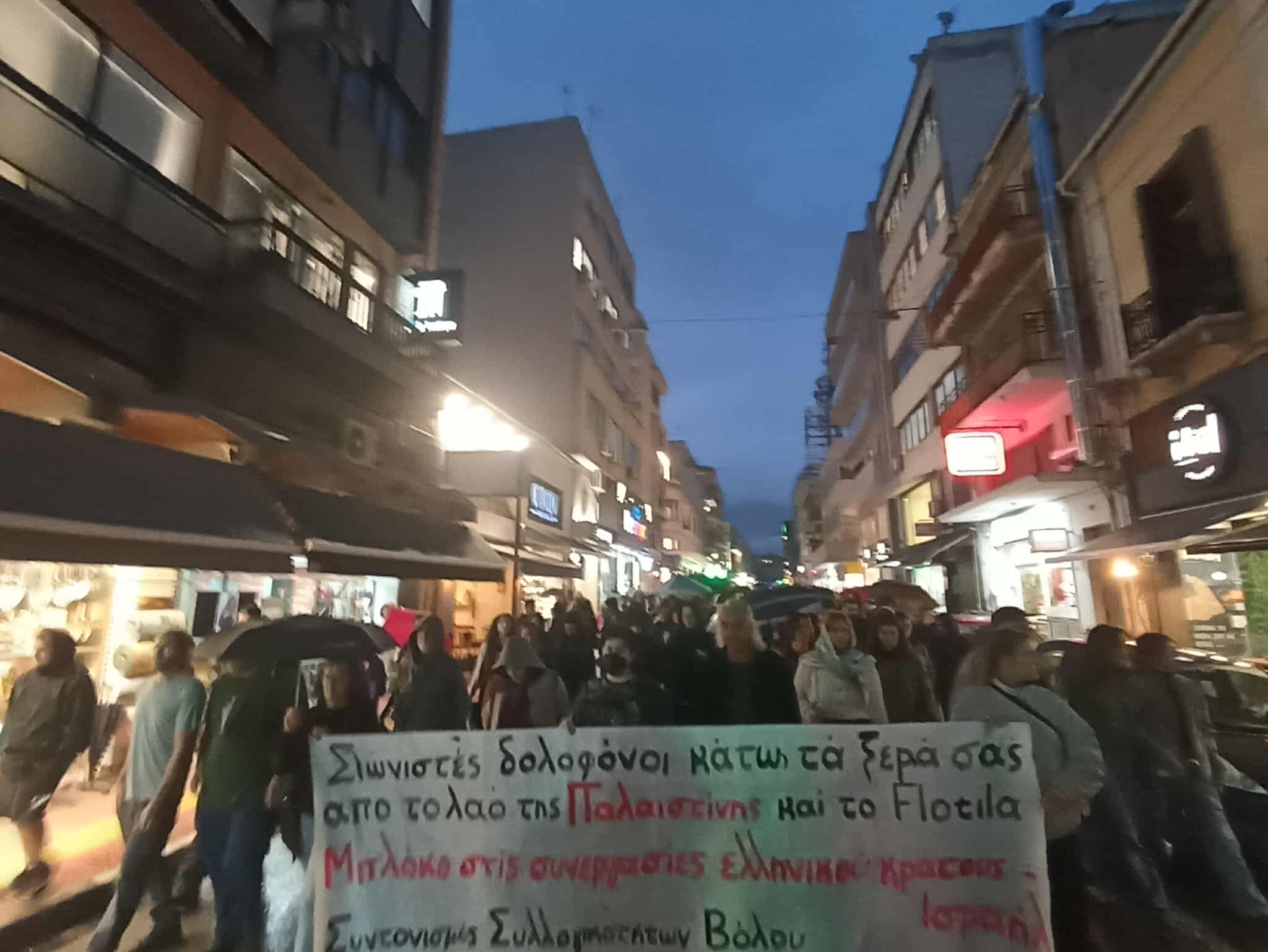 Συγκέντρωση και πορεία στο κέντρο του Βόλου, πραγματοποιήθηκε στον Βόλο στο πλαίσιο της πανελλήνιας κινητοποίησης για την κράτηση και Ελλήνων από δυνάμεις του Ισραήλ μετά το ρεσάλτο των κομάντος του IDF στον στολίσκο που μετέφερε ανθρωπιστική βοήθεια στην Γάζα.