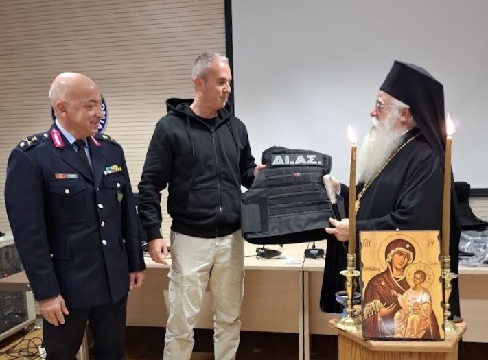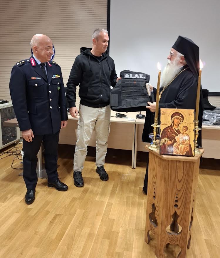 Στο τέλος της εκδήλωσης, ο Σεβ. Ποιμενάρχης μας, παρέδωσε στην Ομάδα ΔΙΑΣ αλεξίσφαιρα γιλέκα και ευχήθηκε σε όλους «δύναμη, υγεία και προστασία από τον Θεό στην καθημερινή, δύσκολη αποστολή τους» ενώ εξέφρασε τις θερμές του ευχαριστίες για την συνεργασία και την προσφορά του Σώματος στην τοπική κοινωνία.