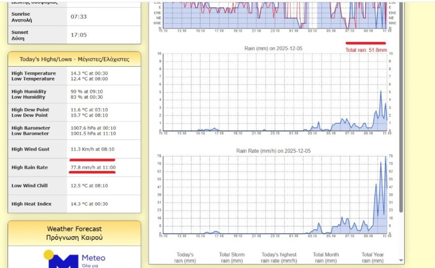 Reading: Ραγδαιότητα 78 mm (78 λίτρα νερού ανά τετραγωνικό επιφάνειας) σήμερα στις 11 π.μ. στον Βόλο