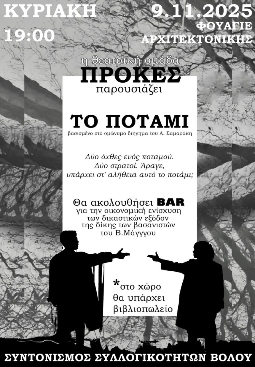 Η θεατρική ομάδα “ΠΡΟΚΕΣ” παρουσιάζουν το έργο “Το ποτάμι” βασισμένο στο ομώνυμο διήγημα του Αντώνη Σαμαράκη. Η θεταρική ομάδα ΠΡΟΚΕΣ είναι μια νεοσύστατη καλλιτεχνική ομάδα όπου δύο καλλιτέχνες συνδημιουργούν και αποφασίζουν χωρίς διακριτούς ρόλους ηθοποιού και σκηνοθέτη.