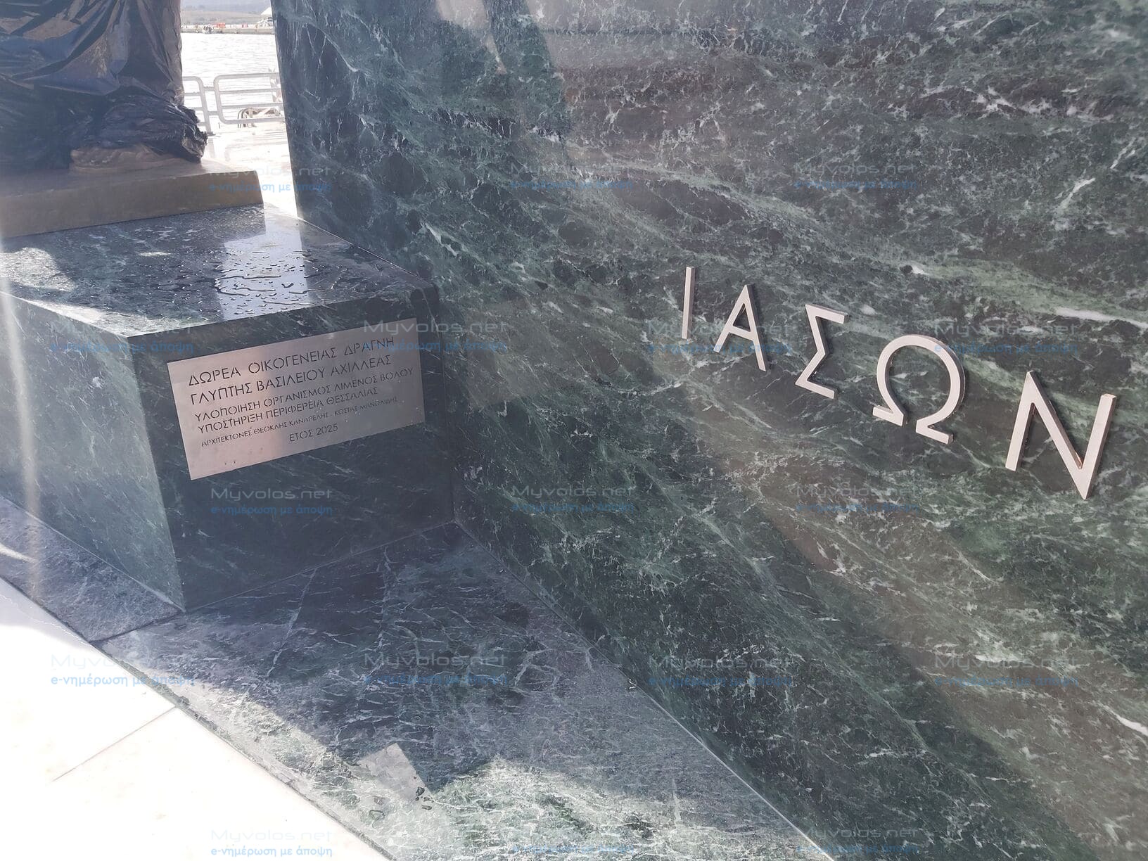Ο Οργανισμός Λιμένος Βόλου, τιμώντας τον μυθικό ήρωα Ιάσονα ο οποίος με τους Αργοναύτες ξεκίνησαν από την Ιωλκό, τον σημερινό Βόλο, την Αργοναυτική εκστρατεία, αποφάσισε και προχώρησε μετά από πρόταση του πρ. προέδρου του Συλλόγου «Αργοναύτες 2008» κ. Νίκου Ντόκου, σε όλες τις απαραίτητες διαδικασίες για την εκπόνηση μελέτης διαμόρφωσης και κατασκευής του χώρου στον κεντρικό προβλήτα. Στον χώρο αυτό, τοποθετήθηκε το άγαλμα, το οποίο φιλοτεχνήθηκε από τον γλύπτη κ. Αχιλλέα Βασιλείου.