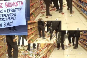 Φωνάζοντας συνθήματα και σκορπίζοντας τρικάκια, ομάδα ατόμων εισήλθε στο σούπερ μάρκετ Σκλαβενίτης στον Βόλο και πέταξε συσκευασίες μπισκότων βιολάντα από…