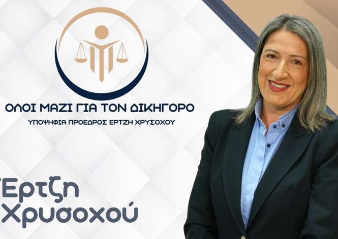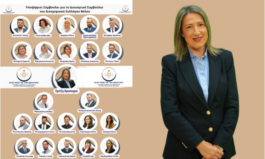 Την υποψηφιότητά της για τη θέση της Προέδρου του Δικηγορικού Συλλόγου Βόλου δημοσιοποίησε η κα Ερτζη (Αργυρώ) Χρυσοχού, επικεφαλής του συνδυασμού «Ολοι μαζί για τον Δικηγόρο».