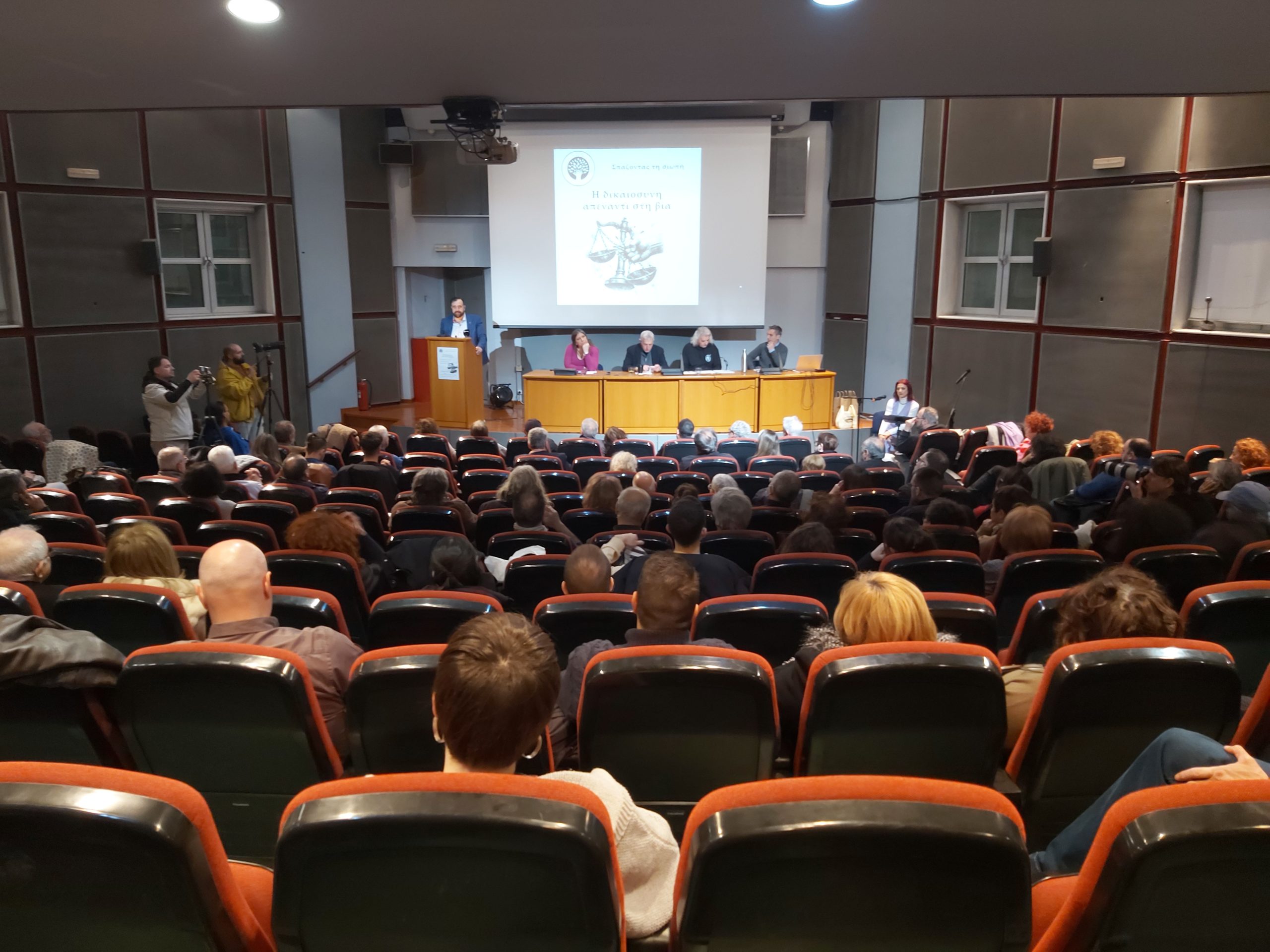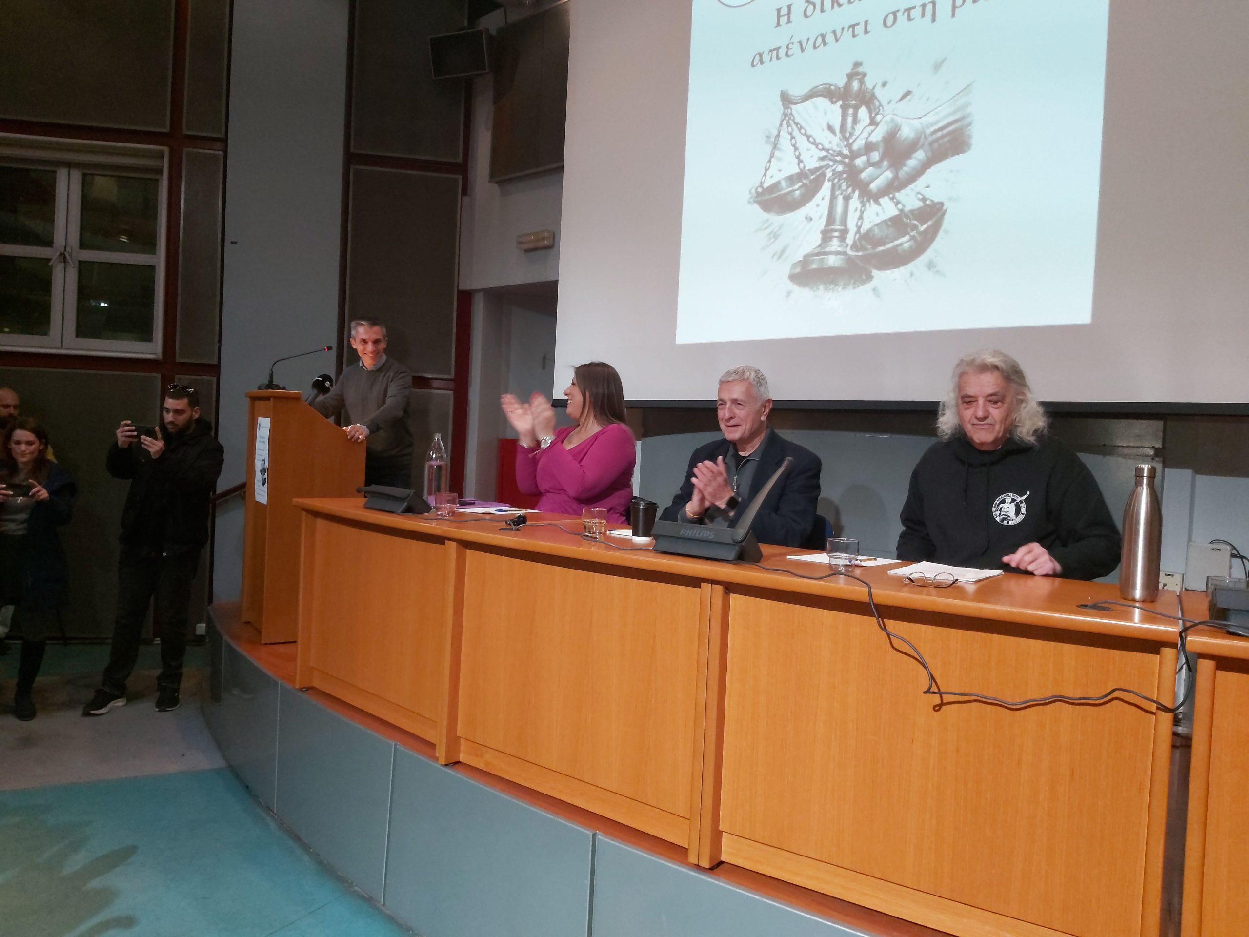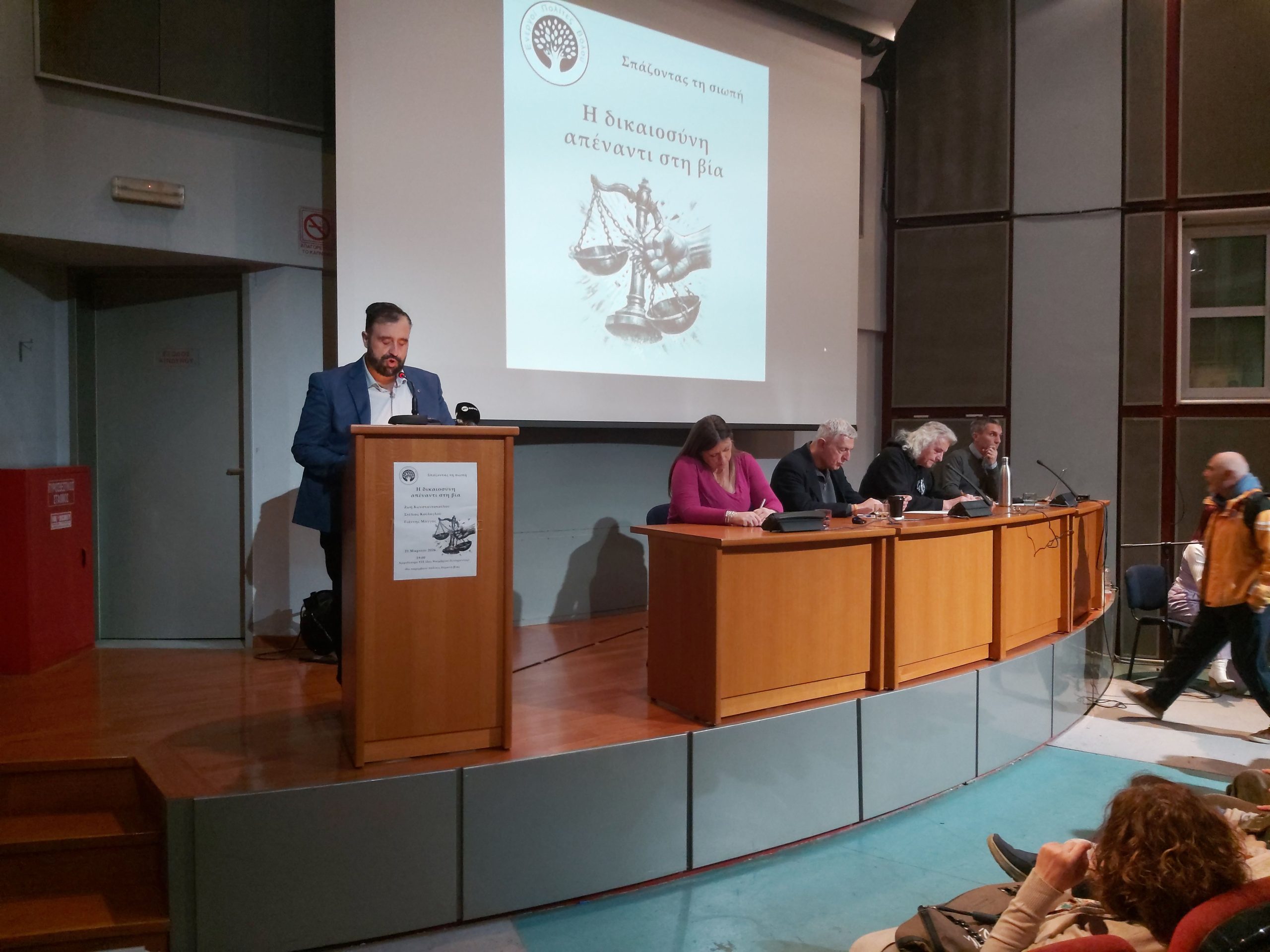 Την εκδήλωση προλόγισαν τα μέλη των Ενεργών Πολιτών κ.κ. Μ. Βαξεβανόπουλος και Γ. Κάιρας ενώ τοποθετήθηκαν ο πρώην Ευρωβουλευτής Στ. Κούλογλου και ο εκπαιδευτικός Γιαν. Μάγγος για την προσπάθεια κανονικοποίησης της πολύμορφης βίας, την κοινωνική ανοχή και την θεσμική εκτροπή.